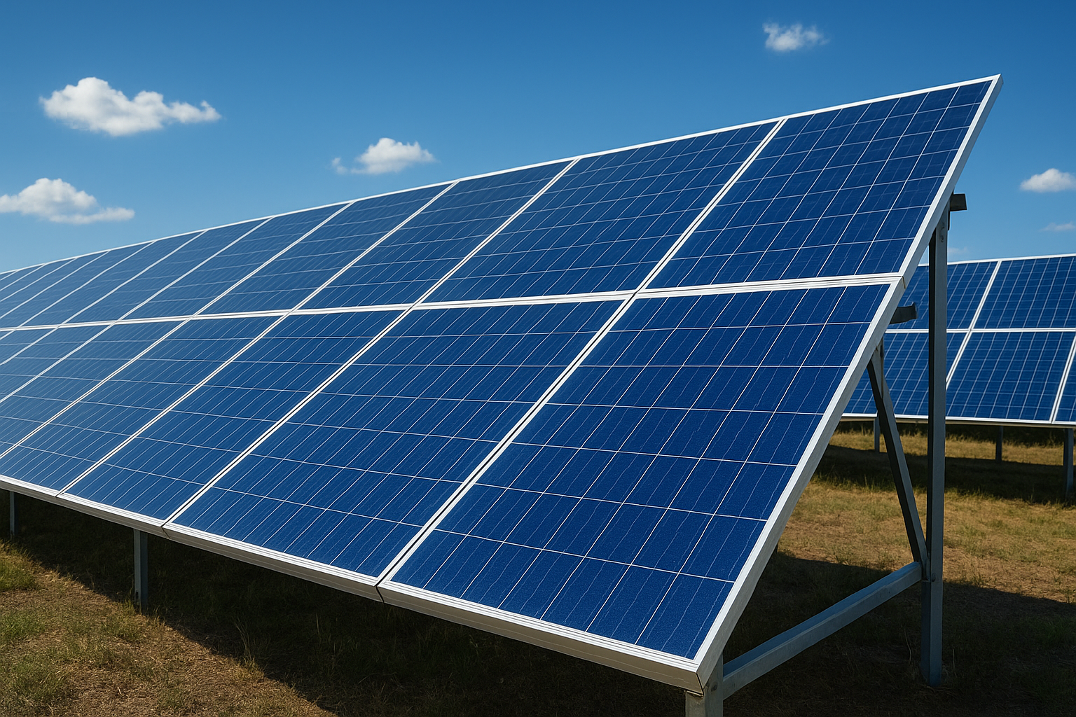 Araziye Monte Edilmiş Fotovoltaik (PV) Panel Dizisi (Yapay Zeka ile Oluşturulmuştur.)