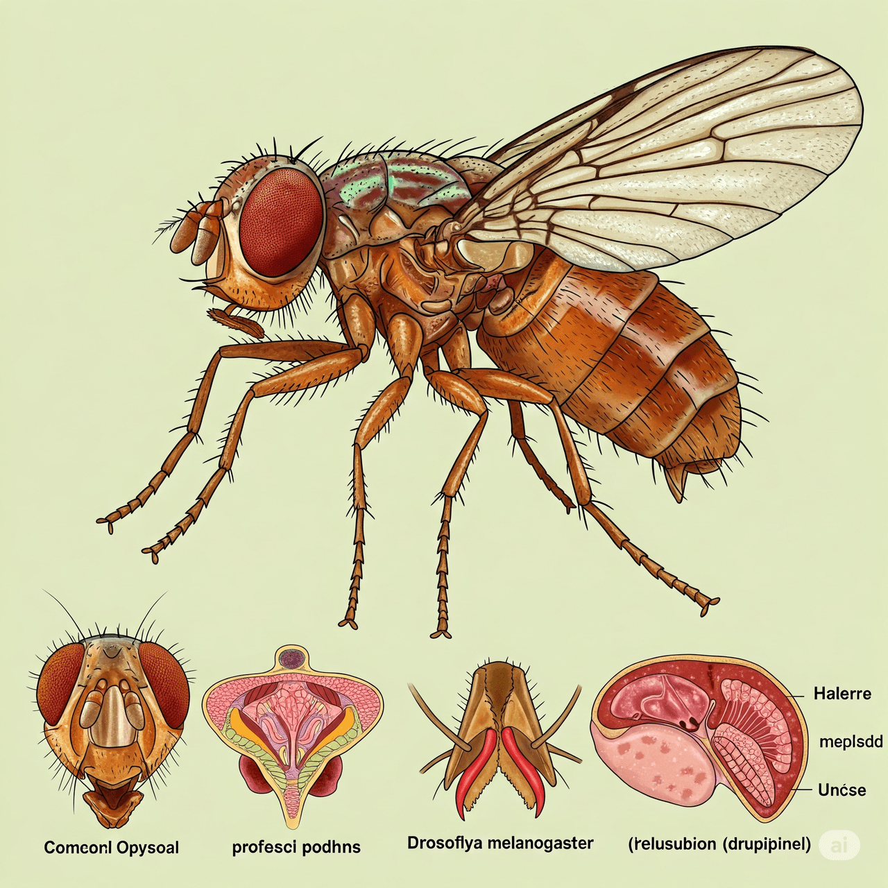 The adult fruit fly’s body is divided into three main parts: head, thorax, and abdomen. The head features prominent compound eyes, three simple eyes (ocelli), and segmented antennae. The third segment of the antenna bears the arista, which contains radial sensilla and plays a role in detecting air currents and pheromone signals. The thoracic segments carry a pair of membranous wings and reduced halteres; these structures contribute to flight stabilization. The abdomen consists of five visible segments in males and seven in females. Sexual dimorphism is easily distinguishable by the presence of dark pigment bands and sex combs on males.
