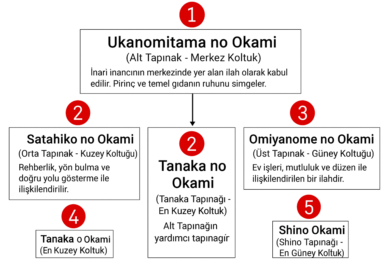 - Ukanomitama no Okami (Alt Tapınak - Merkez Koltuk): Genellikle temel pirinç ve gıda ruhu olarak kabul edilen, Inari inancının merkezini oluşturan ilahtır.