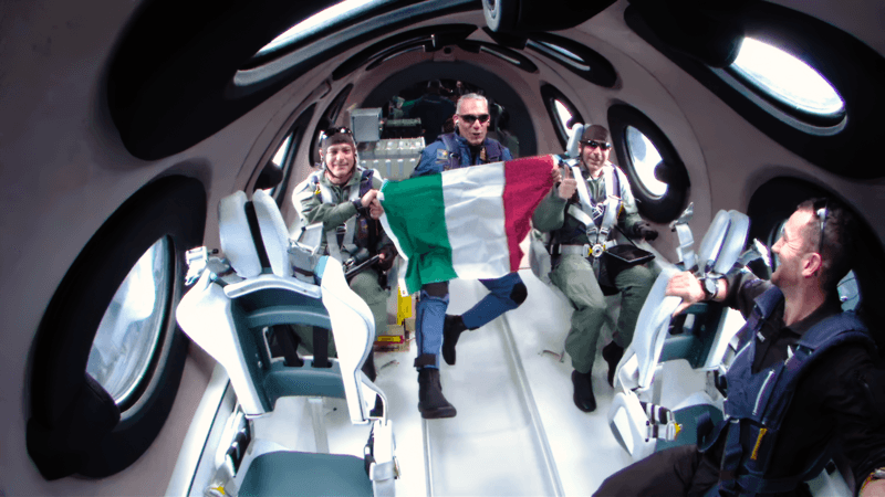 The crew inside, floating in zero gravity with the Italian flag. (Virgin Galactic)
