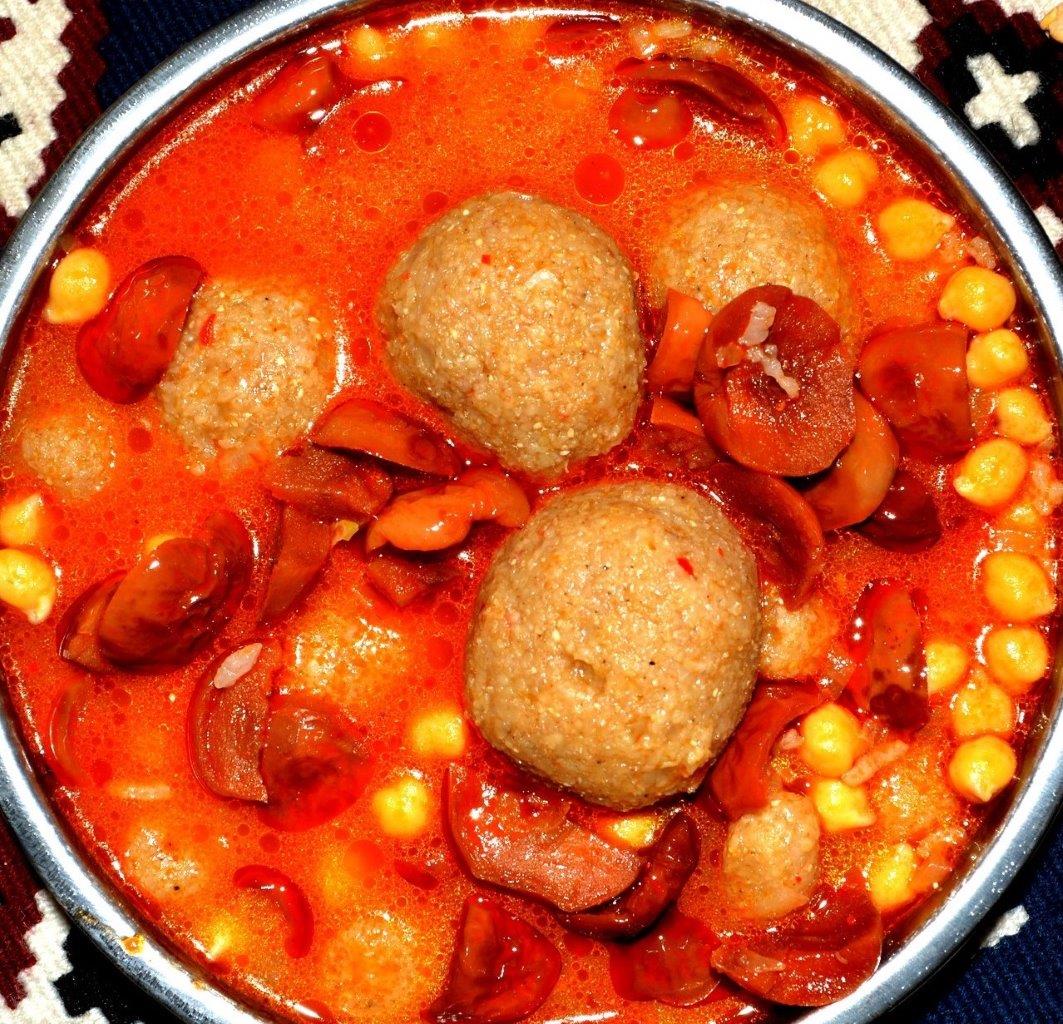 Pişirme aşamasında, kurutulmuş elmalar yumuşaması için kaynatılır. Ayrı bir tencerede soğan, salça ve pul biber ayçiçek yağında kavrulur, ardından kaynar su ilave edilir. Köfteler, haşlanmış nohut, pirinç, elma ve baharatlarla yaklaşık 30 dakika kaynatılır ve servis edilir.