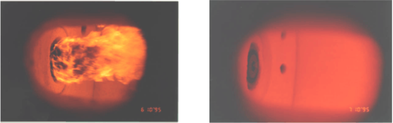 Yukarıdaki şekilde de görüldüğü üzere sol taraftaki görselde belirgin bir alev çekirdeği varken sağ taraftakinde belirgin bir alev çekirdeği yoktur. Yanma homojen bir şekilde gerçekleşmiştir.
