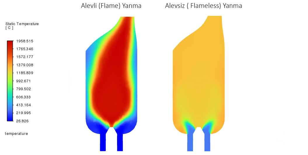 Yapılan analizlerin sonuçları incelendiğinde, klasik alevli yanmada yüksek sıcaklık pikleri ve belirgin bir alev frontu gözlemlenmiştir. Alevsiz yanmada ise, sıcaklık dağılımının daha homojen ve sıcaklık piklerinin belirgin biçimde düşük olduğu ortaya konmuştur. Aşağıdaki görsellerde, ANSYS Fluent ile gerçekleştirilmiş olan analiz sonuçların bulabilirsiniz.