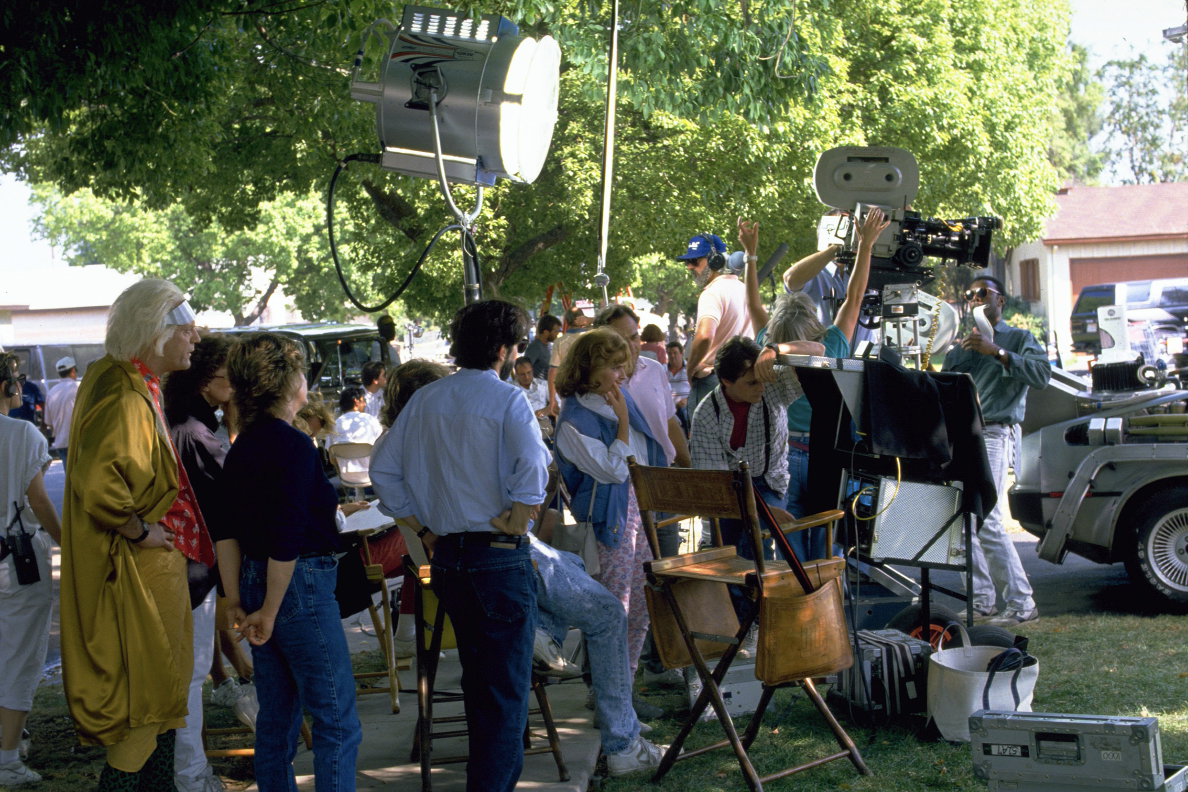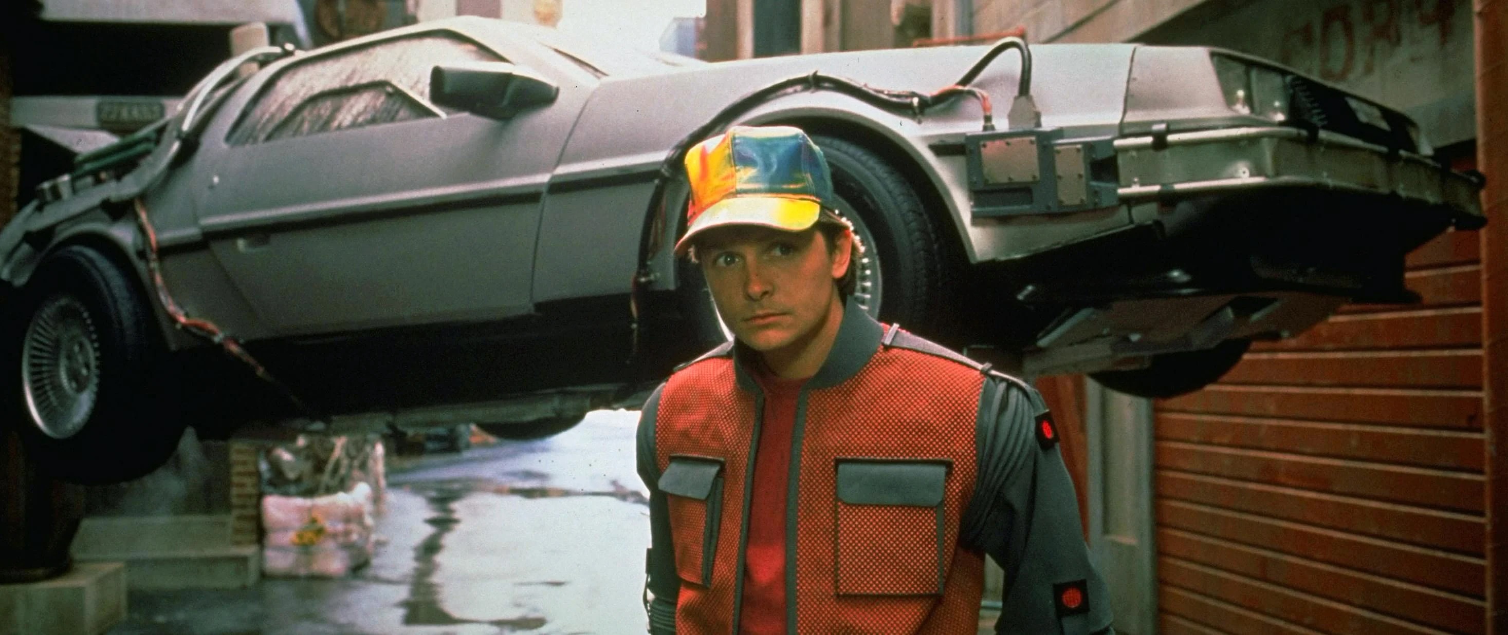 Marty McFly (Michael J. Fox), 2015 yılına gittiği DeLorean zaman makinesinden çıkıyor - American Cinematographer
