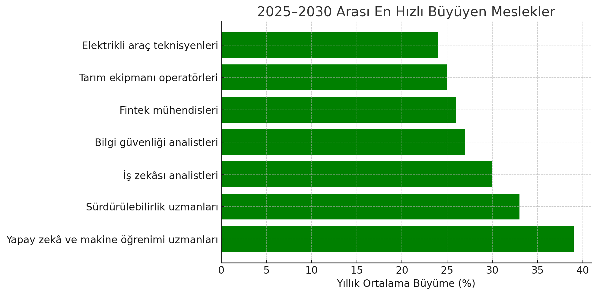 Rapor, 2025–2030 arasında en fazla büyümesi beklenen mesleklerin iki ana eğilimle belirlendiğini ortaya koymaktadır: Teknolojik dönüşüm ve sürdürülebilirlik odaklı yeniden yapılanma. Bu doğrultuda öne çıkan meslek grupları şunlardır: