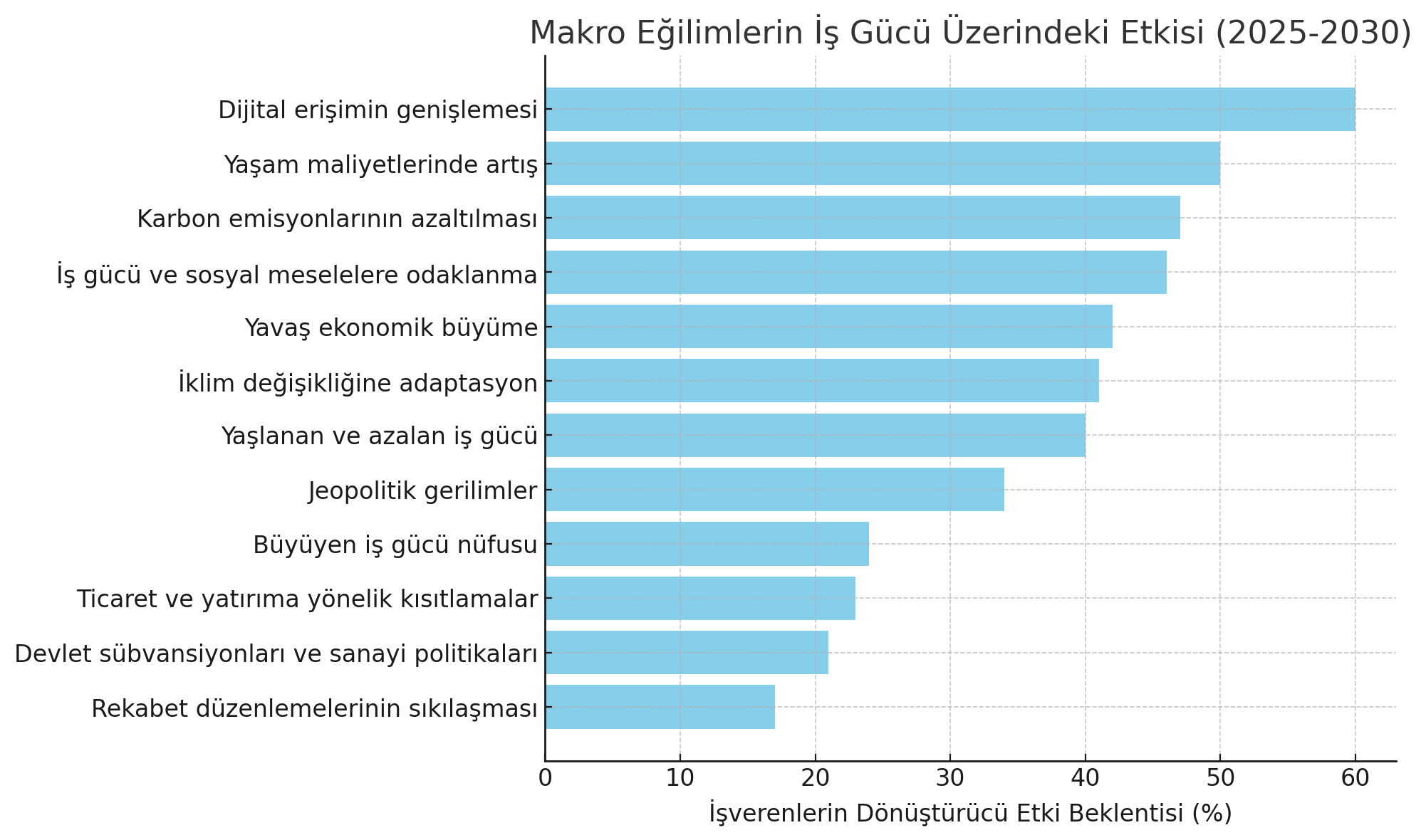 Future of Jobs Report 2025, 2025-2030 döneminde iş gücünde köklü değişimlere yol açacak beş temel makro eğilimi tanımlamaktadır. Bu eğilimler birbirinden bağımsız değil; aksine, çoğu zaman birbirini tetikleyen, çakışan veya dengeleyen yapılar içinde hareket etmektedir. Raporda, işverenlerin dönüşüm beklentilerine göre bu eğilimler aşağıdaki şekilde sıralanmıştır: