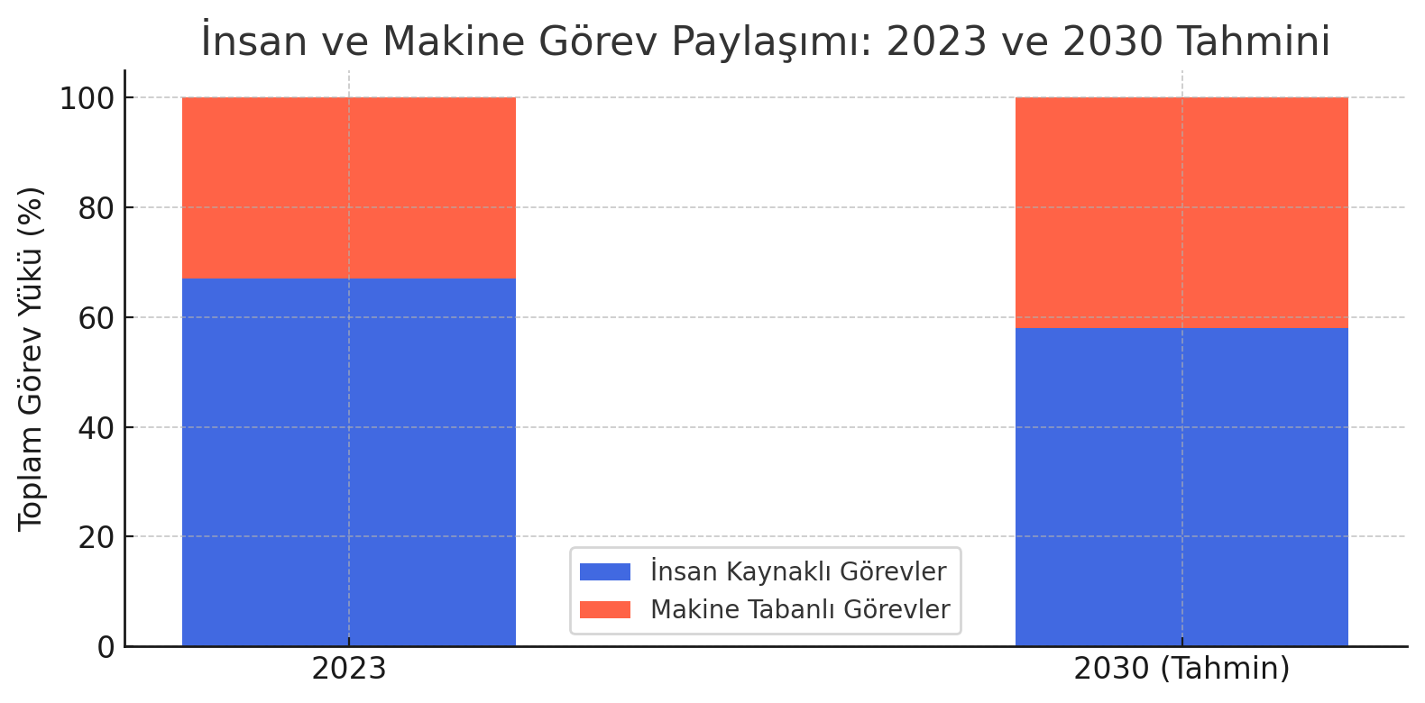 Rapor, iş gücü içinde makine ve insanın görev paylaşımında bulunduğu “hibrid modellerin” yaygınlaştığını ortaya koymaktadır. 2023 itibarıyla insan kaynaklı görevlerin toplam görev yükü içindeki oranı %67 iken, makineler %33’lük bir yükü üstlenmektedir. Bu oranların 2030 itibarıyla sırasıyla %58 ve %42 olacağı tahmin edilmektedir. Bu durum, özellikle rutin görevlerin otomasyonla devredileceği; buna karşılık analitik, yaratıcı ve kişilerarası görevlerde insanın daha da merkezi hâle geleceği bir geleceği işaret eder.