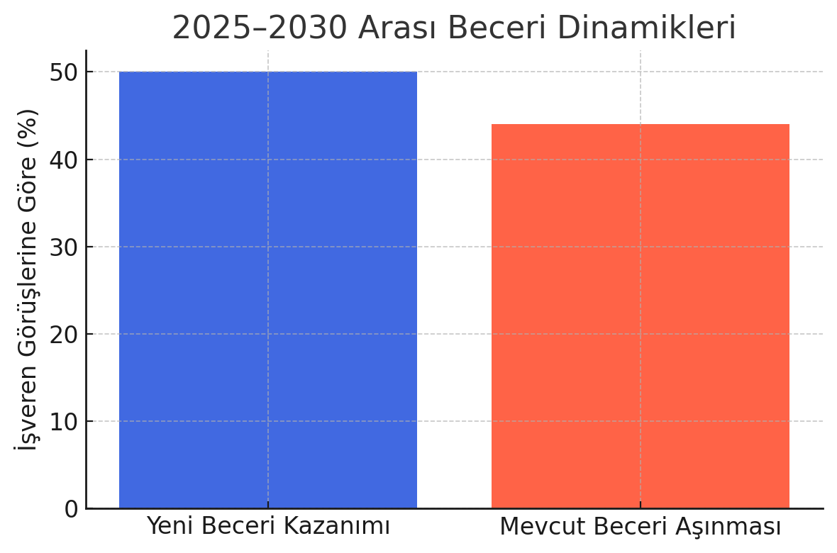 İşverenlerin %75’i, iş gücünün dönüşen beceri ihtiyaçlarına cevap verebilmek amacıyla 2025–2030 döneminde yeniden beceri kazandırma (reskilling) ve yetkinlik artırımı (upskilling) programlarına yatırım yapmayı planlamaktadır.