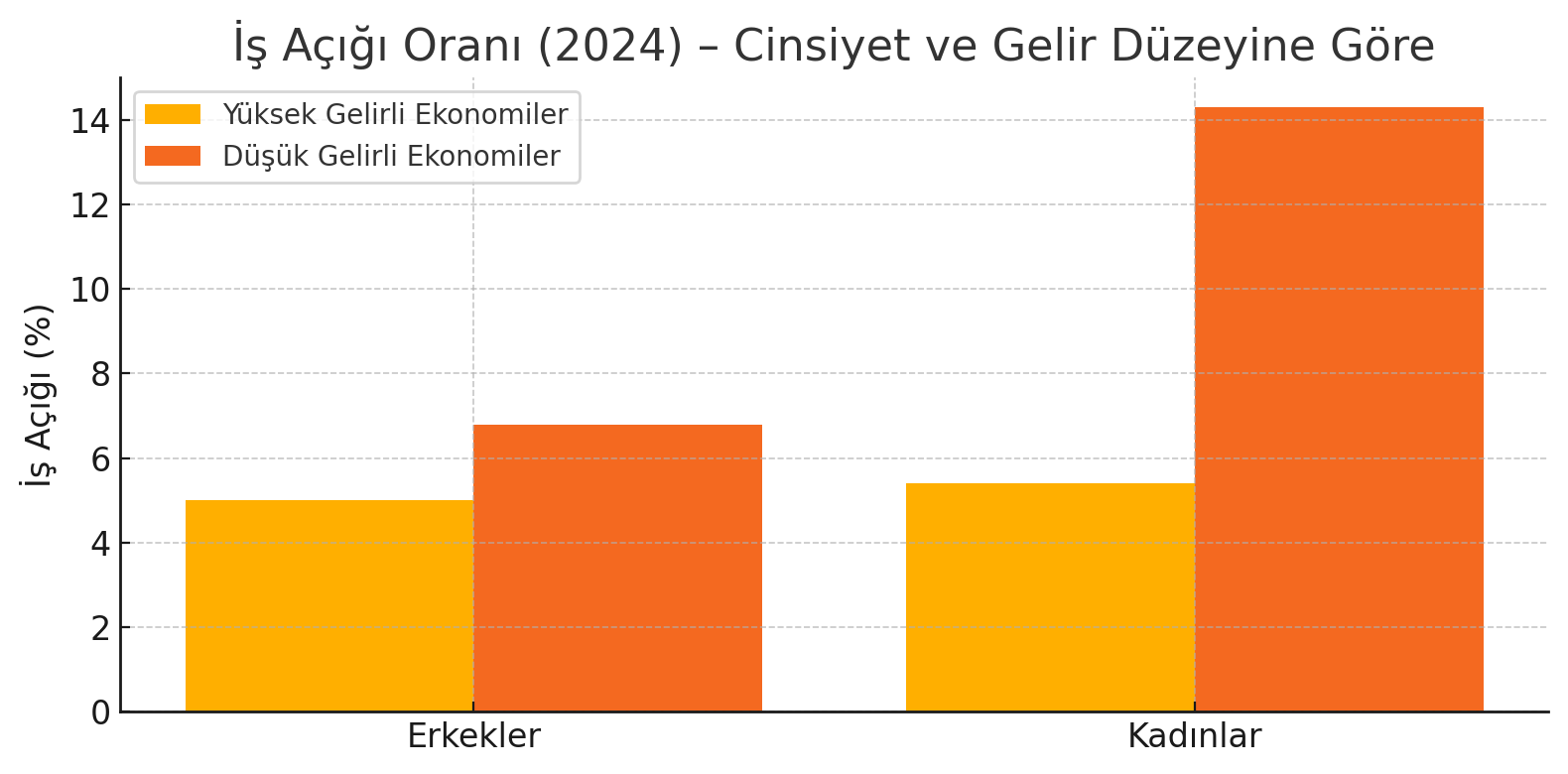 Düşük gelirli ekonomilerde kadınların iş açığı, erkeklerden 7,5 puan daha yüksektir. Aşağıda bu durumu görselleştiren bir grafik sunulmuştur: