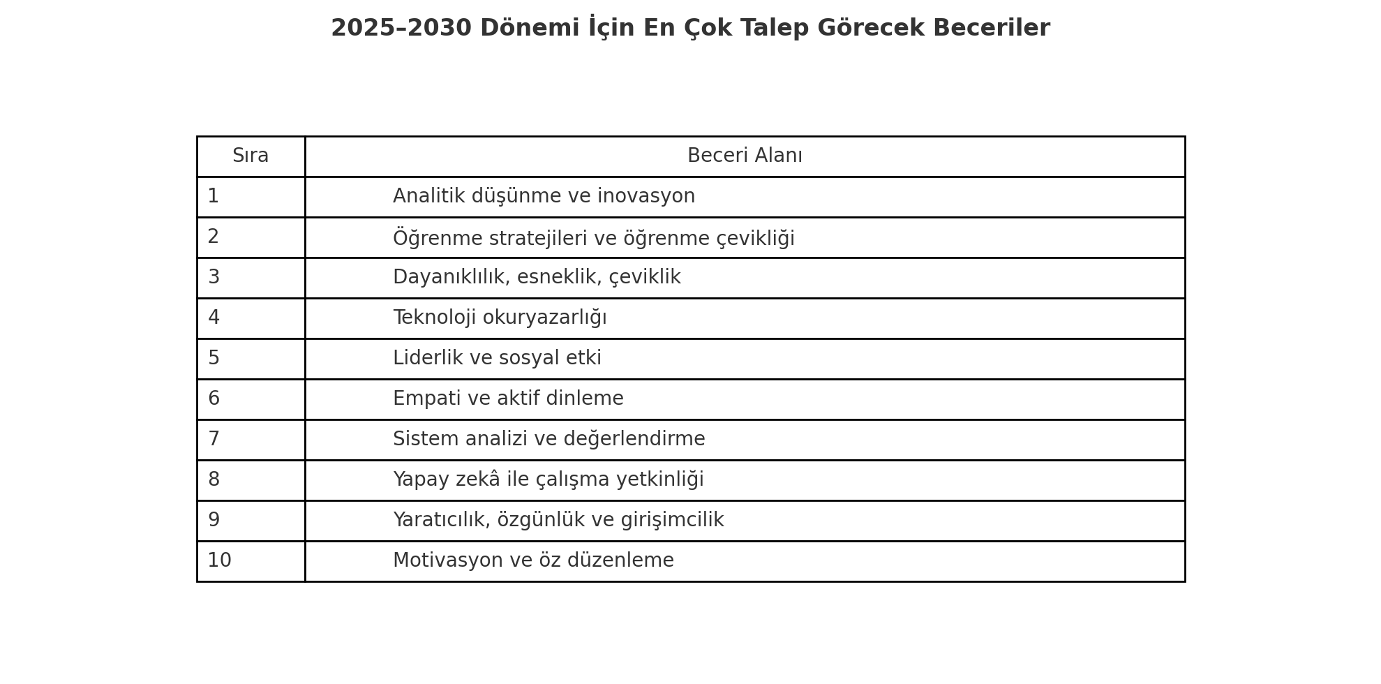 2025–2030 dönemine ilişkin projeksiyonlar, işverenlerin en çok önem verdiği becerilerin bilişsel esneklik, analitik düşünme, yaratıcılık, direnç ve motivasyon gibi insan merkezli yetkinlikler olduğunu göstermektedir.