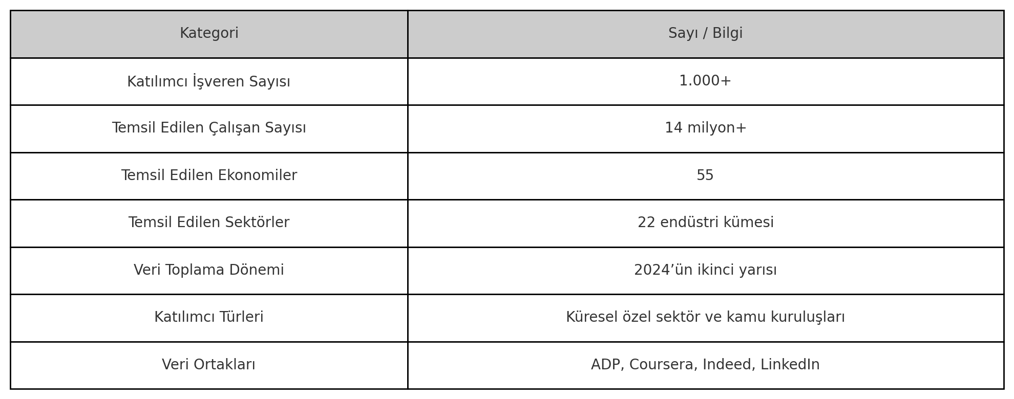 Bu çalışmada, 55 ekonomiyi kapsayan ve 22 sektörel küme üzerinden 14 milyonu aşkın çalışana istihdam sağlayan 1.000’den fazla işverenin öngörüleri esas alınmıştır. Elde edilen bulgular, hem nitel hem de nicel verilerle desteklenmiş; istatistiksel analizlerin yanı sıra ADP, Coursera, Indeed ve LinkedIn gibi veri ortaklarından alınan sektörel içgörülerle zenginleştirilmeye çalışılmıştır.