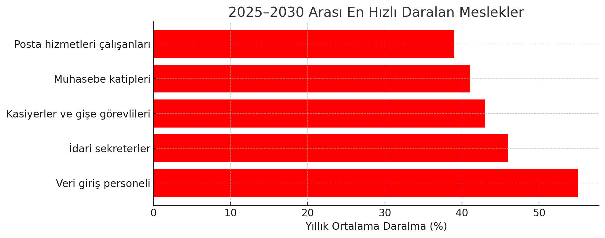 Daralması öngörülen mesleklerin büyük bölümü otomasyon, dijitalleşme ve maliyet optimizasyonu gibi nedenlerle gündemdedir. En çok etkilenecek alanların başında idari destek hizmetleri ve geleneksel bilgi işleme meslekleri gelmektedir:
