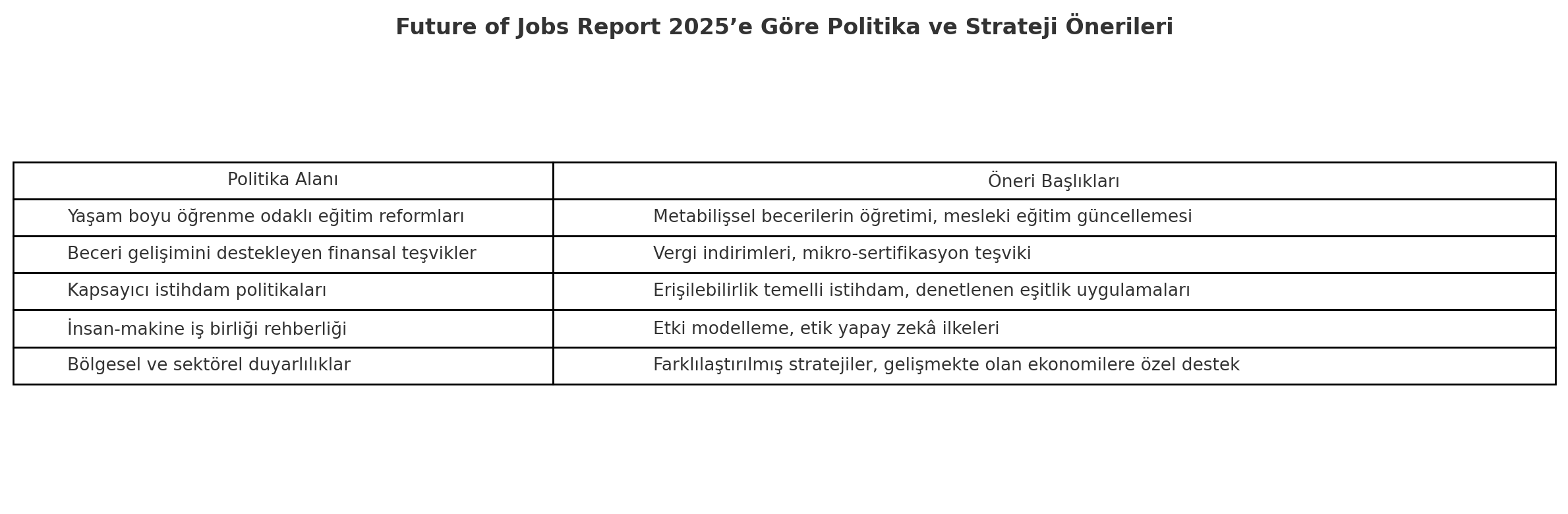 Bu sonuçlar, yalnızca mevcut eğilimleri özetlememekte; aynı zamanda geleceğe yönelik yapıcı müdahalelerin çerçevesini de sunmaktadır. Future of Jobs Report 2025, politika yapıcılar, işverenler, eğitim kurumları ve bireyler arasında koordineli ve uzun vadeli bir dönüşüm planlaması yapılması gerektiğini açıkça ortaya koymaktadır.