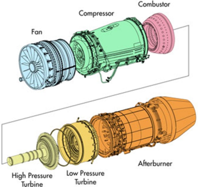 - HPT ve LPT: Ortak şaftlarla sırasıyla HPC ve fan modülünü tahrik eder; modern soğutma teknikleri ve tek kristal alaşımlar kullanılarak imal edilmiştir.