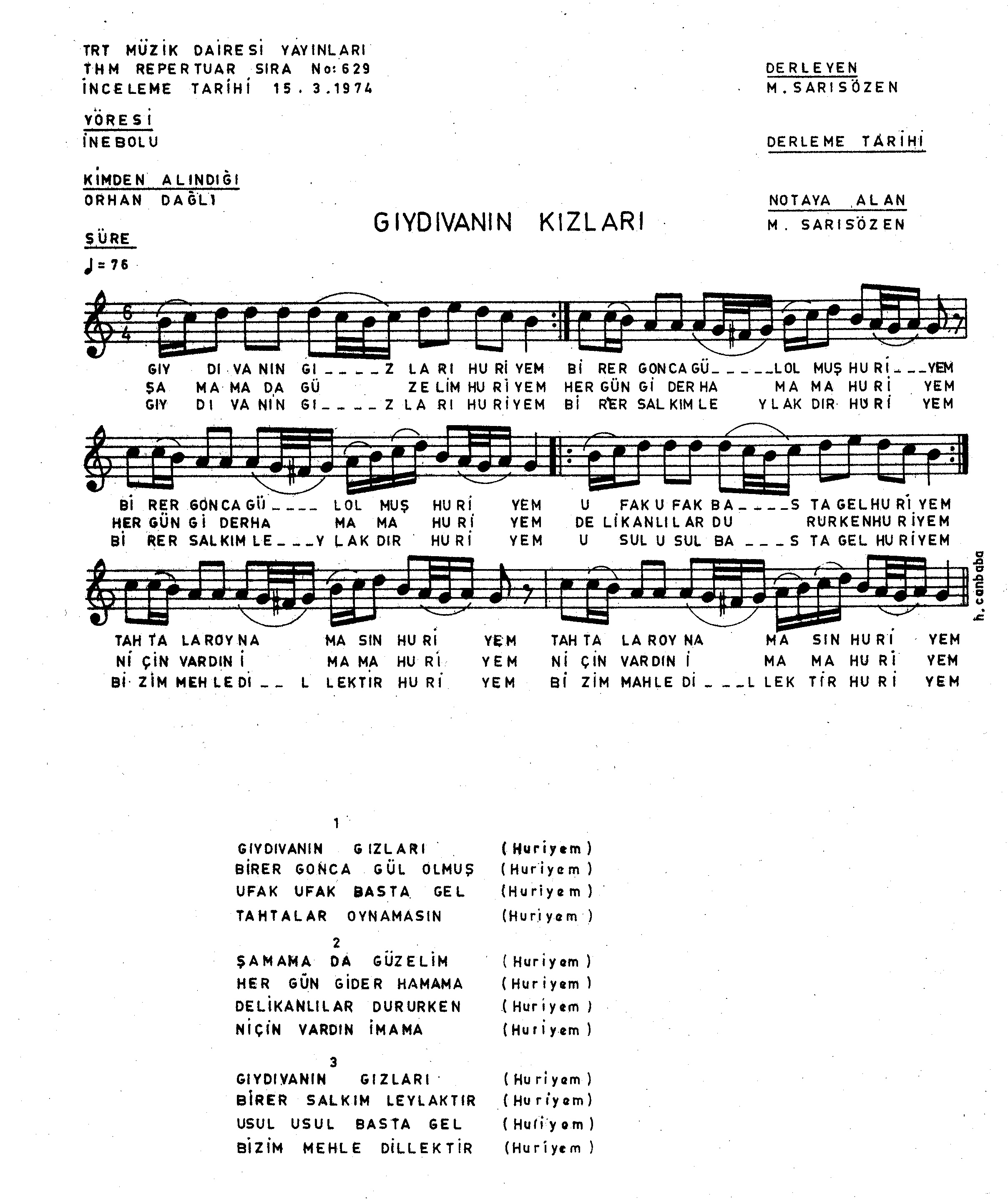 Gıydıvan Türküsü’nün Notaları (Defteriniz)