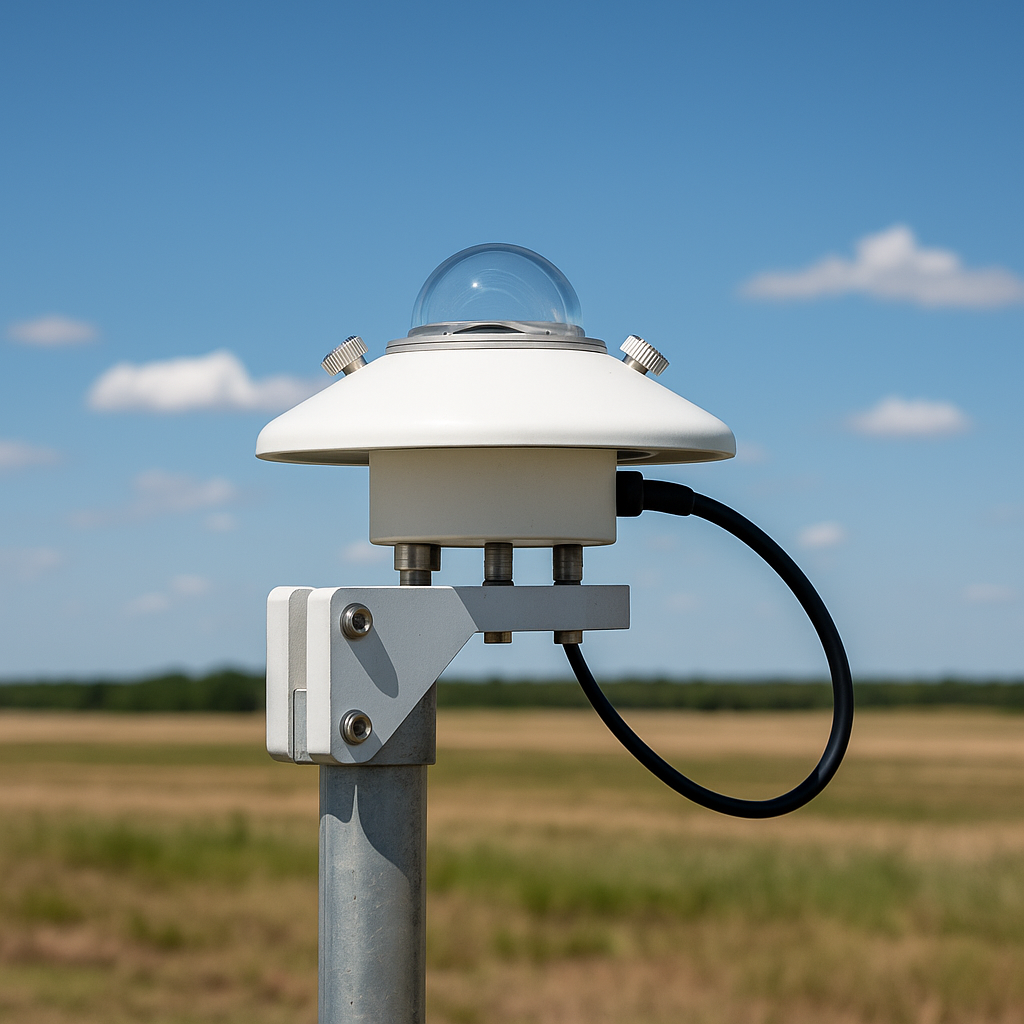 Açık Alanda Kurulmuş Bir Piranometre Aracılığıyla Güneş Radyasyonu Ölçümünü Temsil Eden Bir Görsel (Yapay Zeka İle Oluşturulmuştur.)