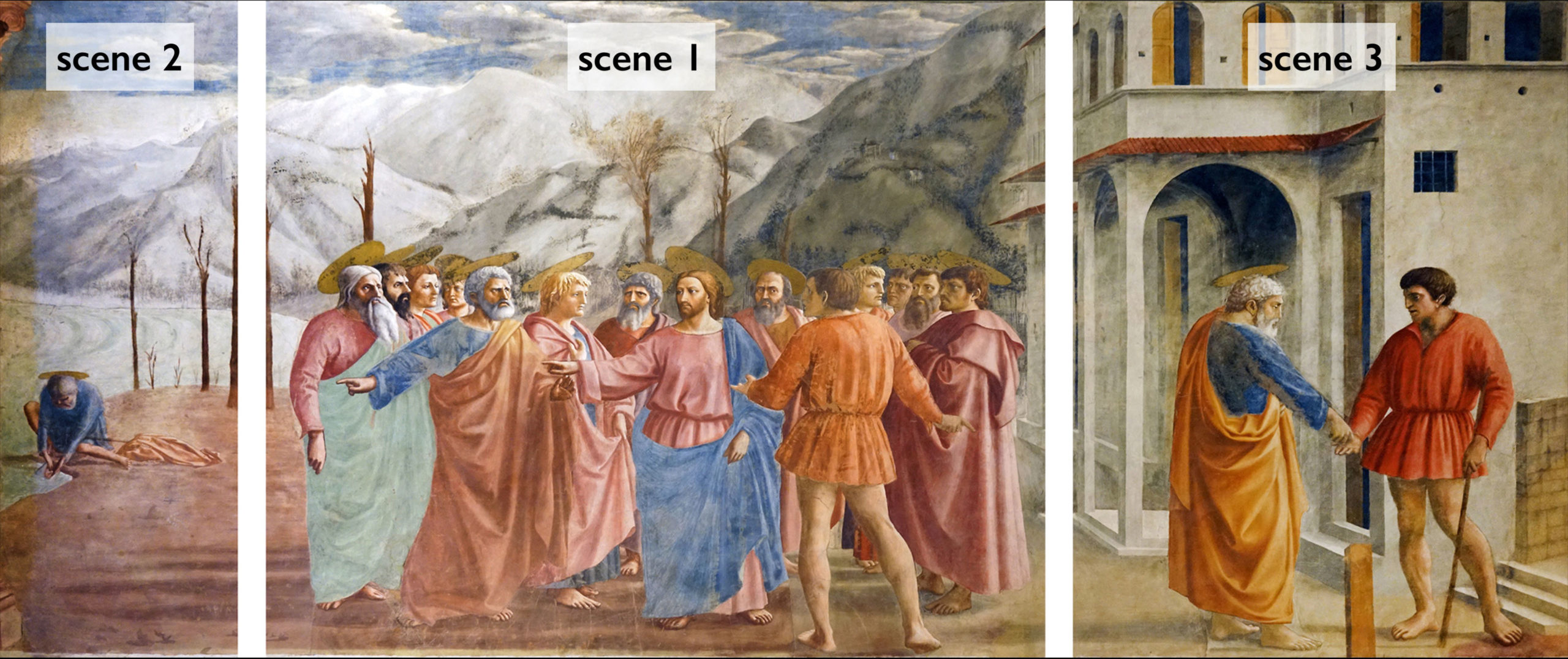 Fresk, Matta 17:24–27’de anlatılan sahneyi üç aşamalı bir sürekli anlatım (continuous narrative) yöntemiyle sunar: