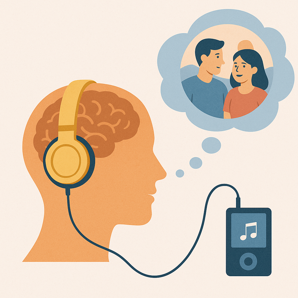 Bir şarkı dinlerken o şarkıyla ilişkili anılarımızın canlanması illütrasyonu. (Yapay Zeka ile oluşturulmuştur.)