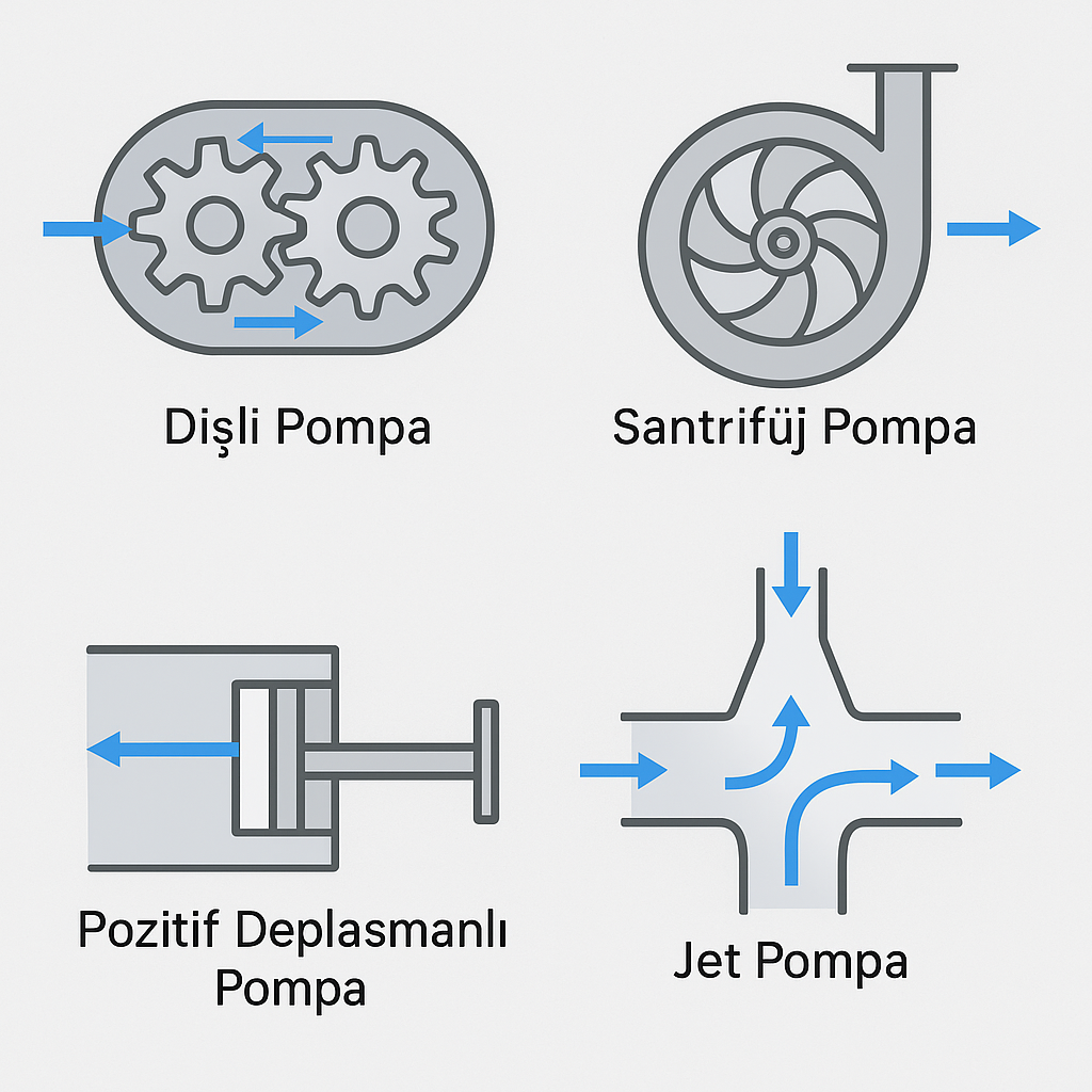 - Dişli Pompa: Dişli çarklar aracılığıyla sıvıyı sıkıştırarak sabit hacimle yüksek basınç sağlar. Genellikle düşük debi, yüksek basınç gereken sistemlerde kullanılır.