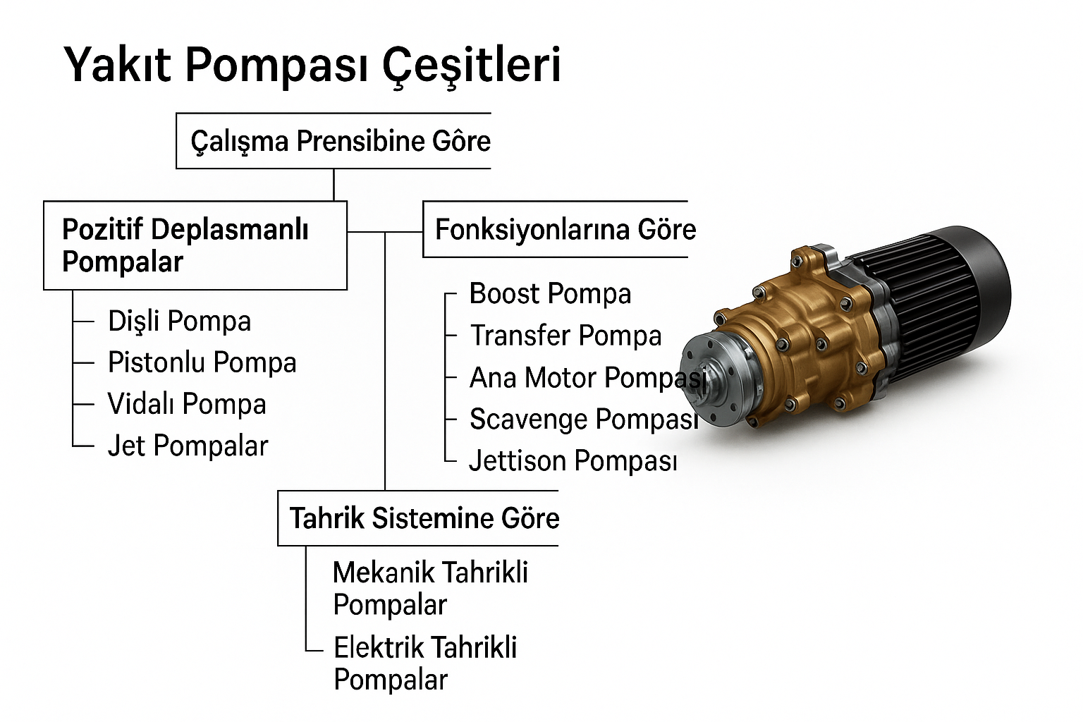 Hava aracı yakıt pompaları, çalışma prensiplerine, fonksiyonlarına ve tahrik sistemlerine göre çeşitli türlerde sınıflandırılmaktadır: