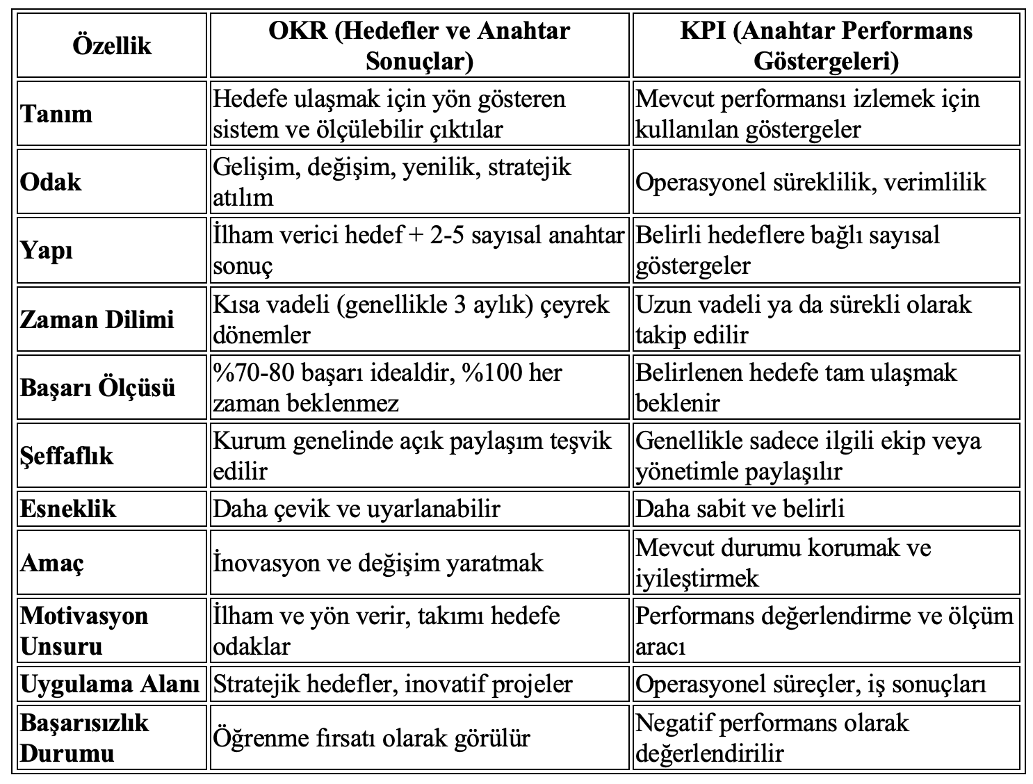 OKR, sıklıkla KPI (Key Performance Indicator) ile karıştırılmaktadır. Her iki sistem de performans ölçümüne hizmet etse de temel farkları bulunmaktadır. Farklar aşağıdaki tabloda detaylandırılmıştır.