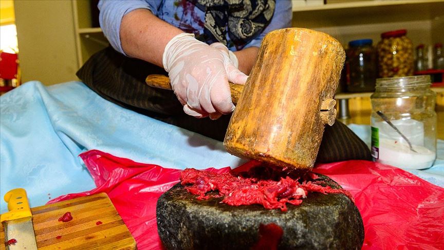 - Etin hazırlanması: Seçilen etler sinir, damar ve fazla yağlarından arındırılır. Etler dövme taşında, gıda ile temasa uygun tokmak yardımıyla dövülerek kıyma hâline getirilir.