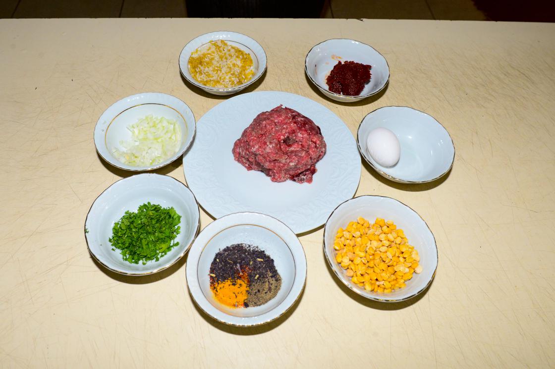 - Köfte harcının hazırlanması: Dövülmüş ete domates salçası, sıvı yağ (veya iç yağı), ince kıyılmış maydanoz, haşlanmış lepe ve yıkanmış pirinç ilave edilerek yoğrulur. Ardından sarıkök, karabiber ve yumurta eklenerek yoğurma işlemine devam edilir. Köftelerin pişerken dağılmaması için harcın iyice yoğrulması önemlidir.