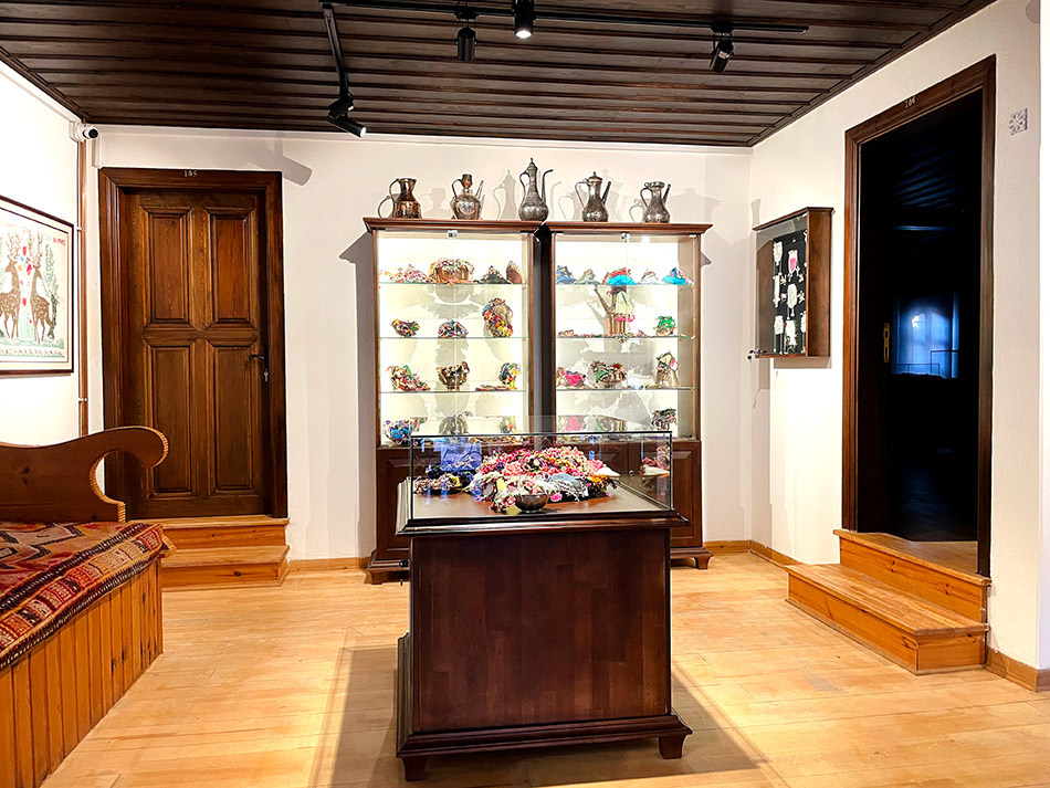 - İkinci Kat: Duvarlarda cam altı halk sanatı örnekleri sergilenmekte; vitrinlerde iğne oyalı üfürük yazmalar, boncuk oyalar, seramik ve cam eserler yer almaktadır.
