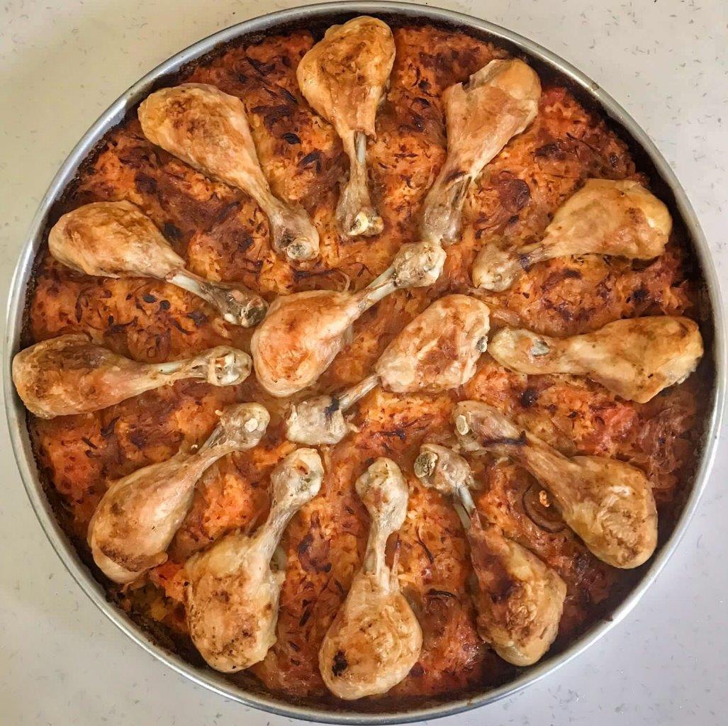 - Birleştirme ve Fırınlama: Fırından çıkan pilavın üzerine kavrulan soğan ve domates karışımı yayılır, üzerine haşlanmış tavuk butları, kuzu eti veya tavuk parçaları tarifte belirtilen şekilde yerleştirilir. Önceden 200 °C’ye ısıtılmış fırında yaklaşık 20 dakika pişirilir.