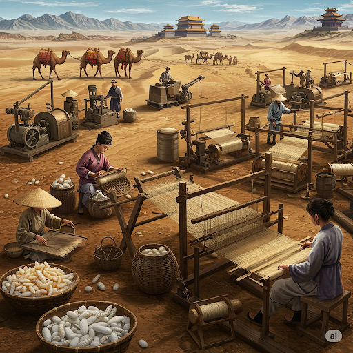 İpek Yolu'nda İpek Üretimi. (Yapay zeka ile oluşturulmuştur.)