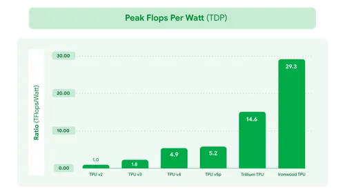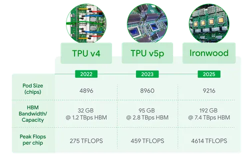 Her Ironwood çipi FP8 formatında 4.614 TFLOP işlem gücü sunar. 192 GB yüksek bant genişlikli bellek (High Bandwidth Memory, HBM) kapasitesi, önceki nesil Trillium TPU’nun altı katıdır. Bellek bant genişliği çip başına 7,2 TBps seviyesindedir. Ironwood’un mimarisi, veri aktarım gecikmelerini en aza indirmeyi ve geniş tensor işlemlerinde verimliliği artırmayı hedefler.