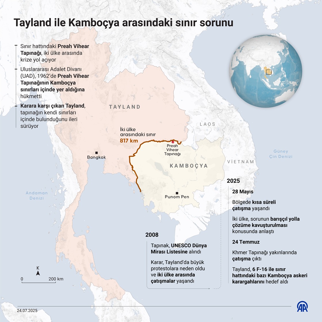 Tayland ve Kamboçya arasındaki ilişkiler, temelinde Preah Vihear Tapınağı'nın mülkiyeti üzerinden yükselen ve kökleri sömürge dönemine dayanan bir gerilime sahiptir. Bu husumet, 24 Temmuz'da sınırda fiili çatışmaya dönüşerek bölgeyi bir savaşın eşiğine getirmiştir. Anlaşmazlığın özü, 11-12. yüzyılda Khmer İmparatorluğu tarafından inşa edilen bu Hindu tapınağının, 19. yüzyılda Fransız sömürgeciler tarafından çizilen ve çelişkili haritalarla belirsizliğe itilen sınırlara dayanır. Sömürge güçlerinin 1904 ve 1907'de çizdiği farklı haritalar, tapınağı birinde Tayland'a, diğerinde ise Kamboçya'ya bırakarak mevcut olayın zeminini hazırlamıştır.