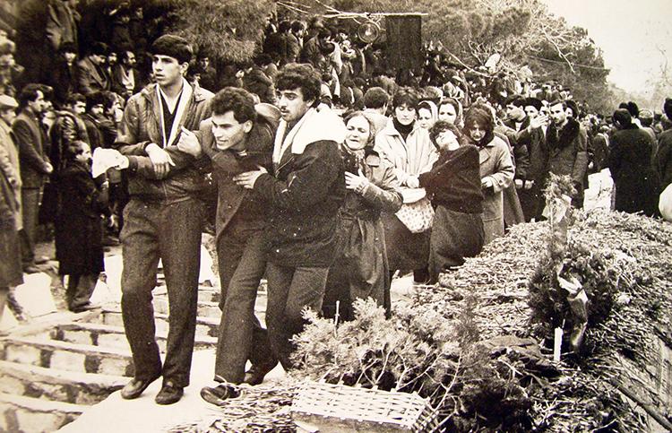 Defin yeri olarak Dağüstü Park seçilmiştir. Bu alan, 31 Mart 1918’deki saldırılar sırasında hayatını kaybeden Azerbaycanlıların mezarlarının bulunduğu; Sovyet döneminde park hâline getirilen bir mekândır. Buraya getirilen cenazeler yan yana defnedilmiştir ve alan zamanla Şehitler Hıyabanı adıyla anılan bir anma mekânına dönüştürülmüştür. Cenaze törenlerine katılımın 1 milyon ile 2 milyon kişi arasında olduğu tahmin edilmektedir.