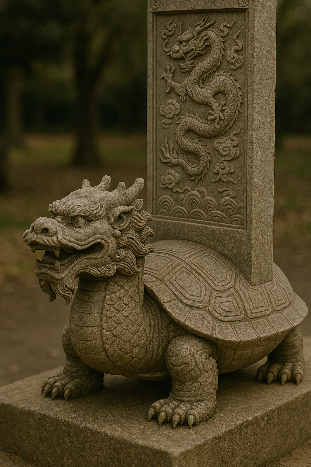 Çin mitolojisinde kaplumbağa, dört kutsal yaratık arasında yer almakta ve bu yaratıklar arasında en bilgesi olarak kabul edilmektedir. Söz konusu dört kutsal varlık; ejderha, anka kuşu, kaplan ve kaplumbağadır. Özellikle kara kaplumbağa (Xuanwu), Çin kültüründe bilgelik, uzun ömür, evrensel denge ve toprak elementiyle ilişkilendirilen önemli bir figürdür. Bu sembolik anlamlar Çin mimarisine de yansımıştır. Tapınakların temellerinde yer alan kaplumbağa kabartmaları, yapıların uzun ömürlü olacağı inancını simgelemiştir.