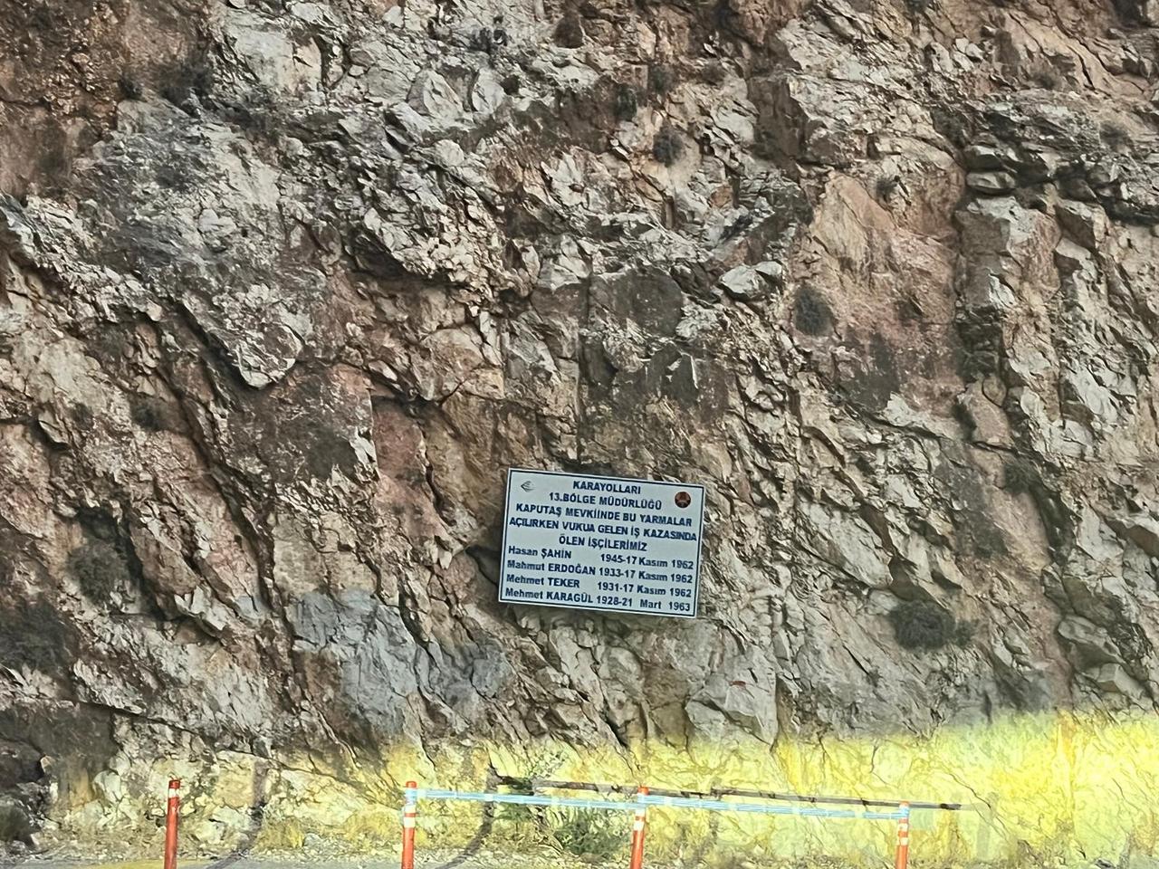 During the construction of the Kaş-Kalkan highway in the early 1960s, four workers lost their lives in accidents that occurred in the Kaputaş area. On November 17, 1962, Hasan Şahin (born 1945), Mahmut Erdoğan (1933), and Mehmet Teker (1931) were killed in an incident. On March 21, 1963, another worker, Mehmet Karagül (1928), also lost his life.