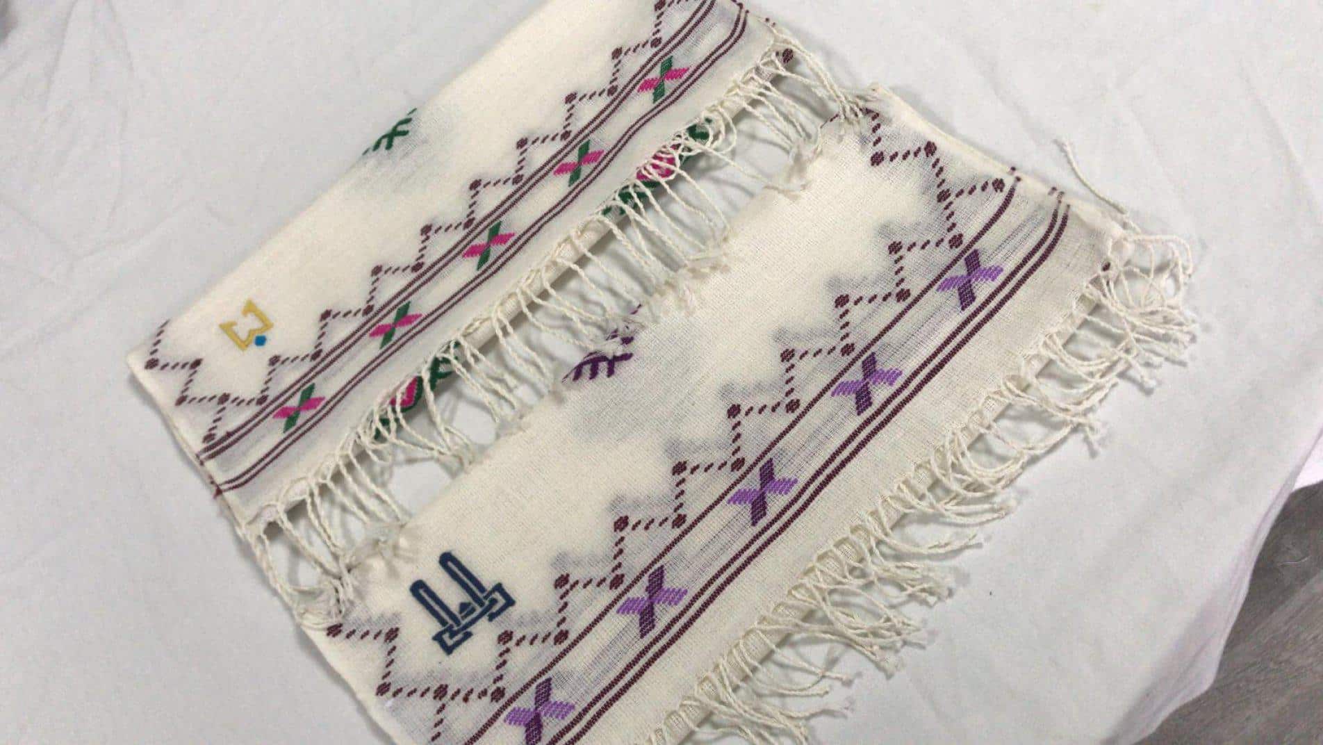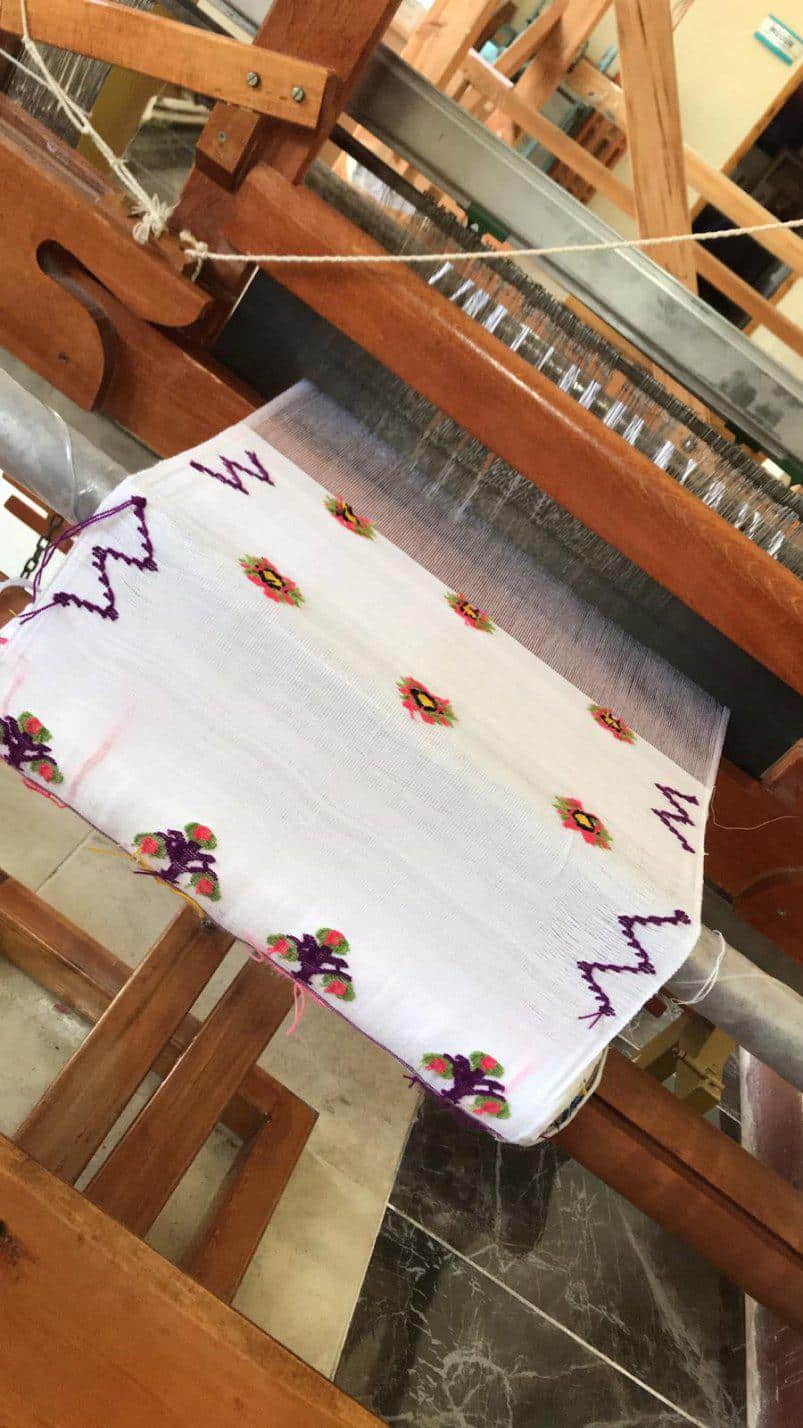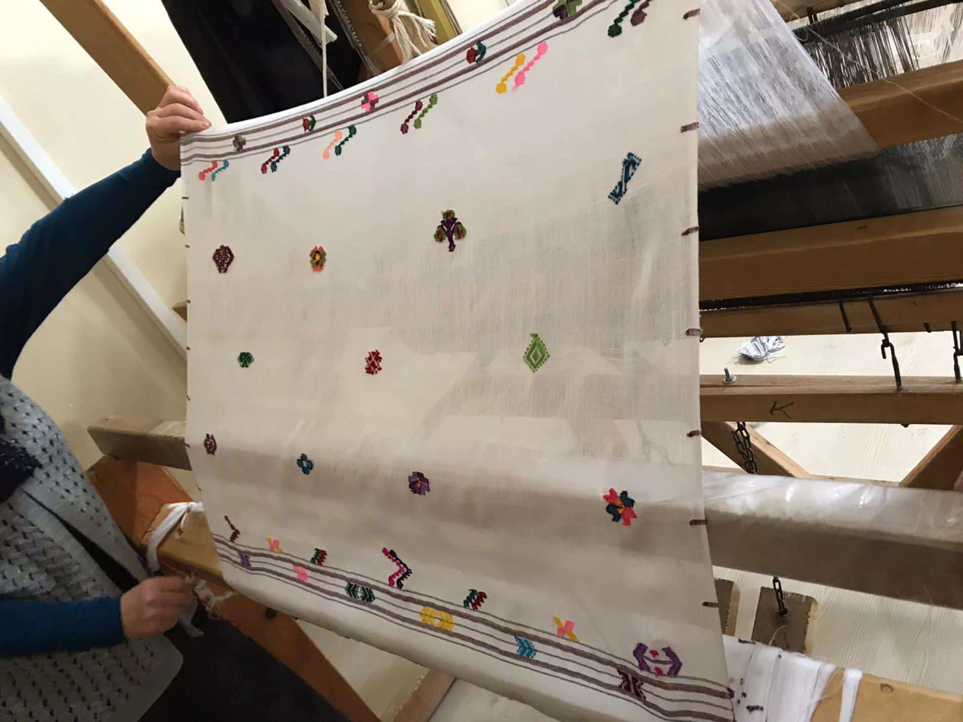 Karnavas bezi, %100 pamuk ipliği ile bezayağı dokuma tekniği kullanılarak kamçılı tezgâhlarda üretilmektedir. Bez, her biri yaklaşık 160x55 cm boyutunda dokunan iki parçanın elde dikilerek birleştirilmesiyle toplamda 160x110 cm ebatına ulaşmaktadır. Dokuma işlemi sırasında 100’lük taraklar kullanılmakta, motif ve desenler ise dokuma sırasında atkı ve çözgü ipliklerinin arasına sıkıştırılan renkli ipliklerle oluşturulmaktadır. Motifler önceden çizilmiş desen kâğıtları yardımıyla düzenli aralıklarla dokunur.