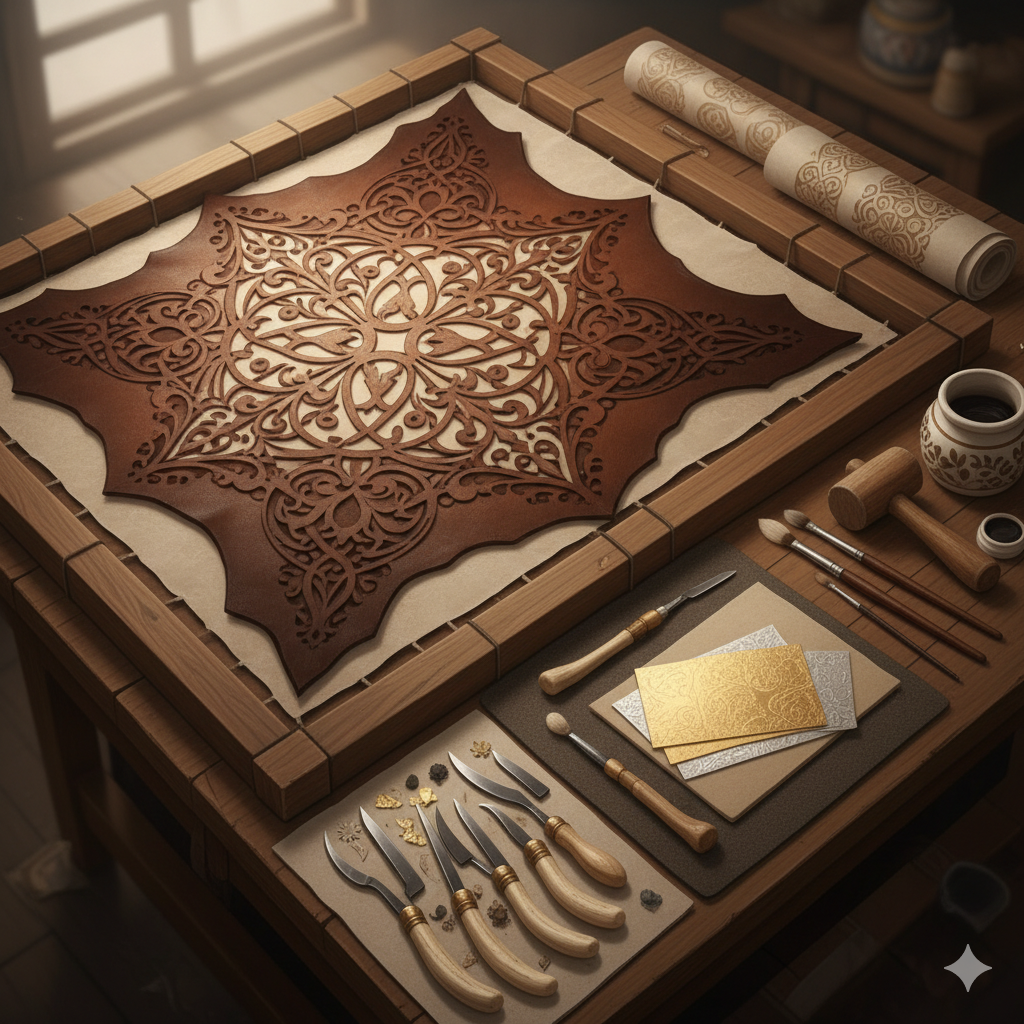 Deri Üzerine Yapılan Katı' Sanatı ve Malzemeleri (Yapay Zeka ile Oluşturulmuştur.)