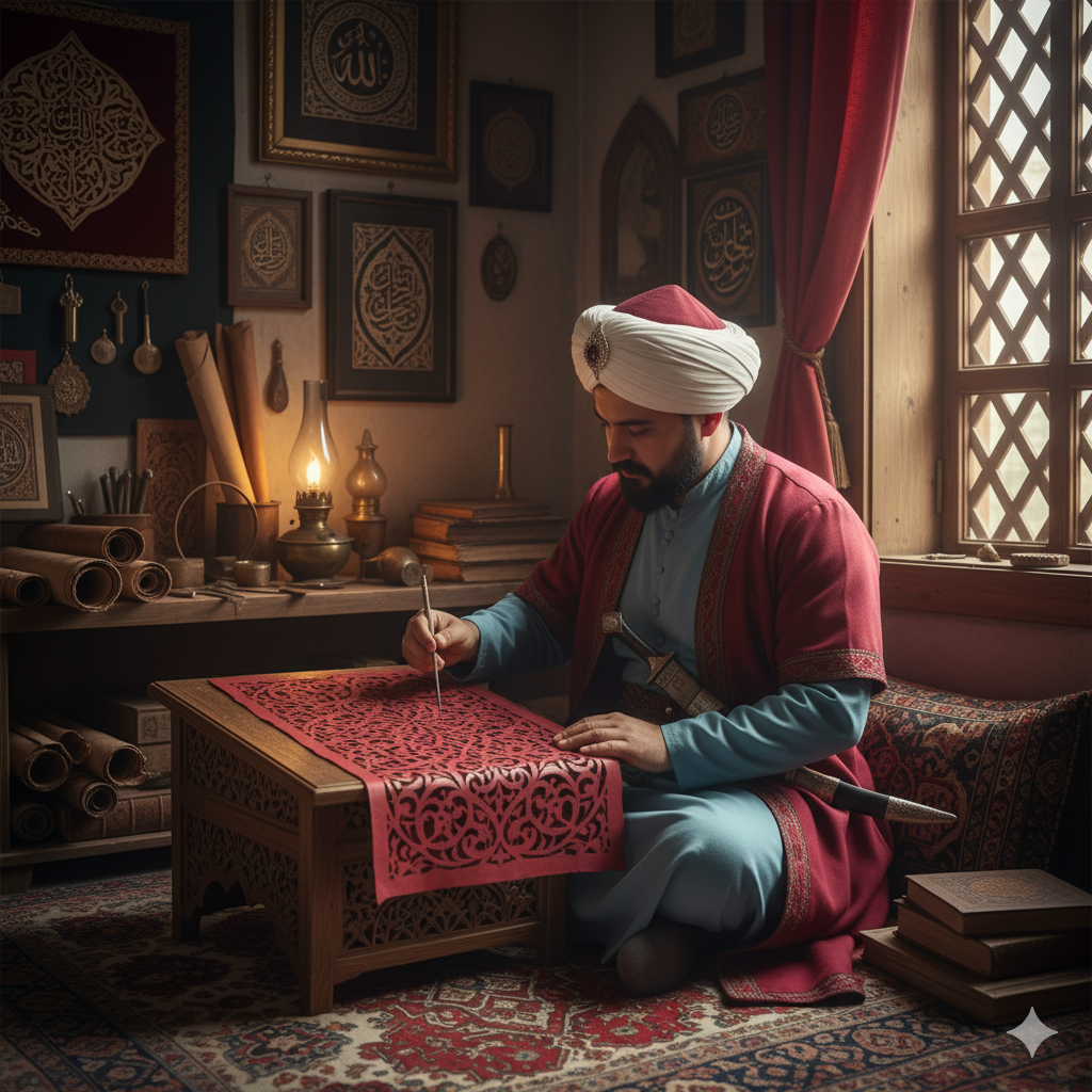 15. Yüzyılda Katı' Sanatı iİra Eden Bir Sanatçı (Yapay Zeka ile Oluşturulmuştur.)