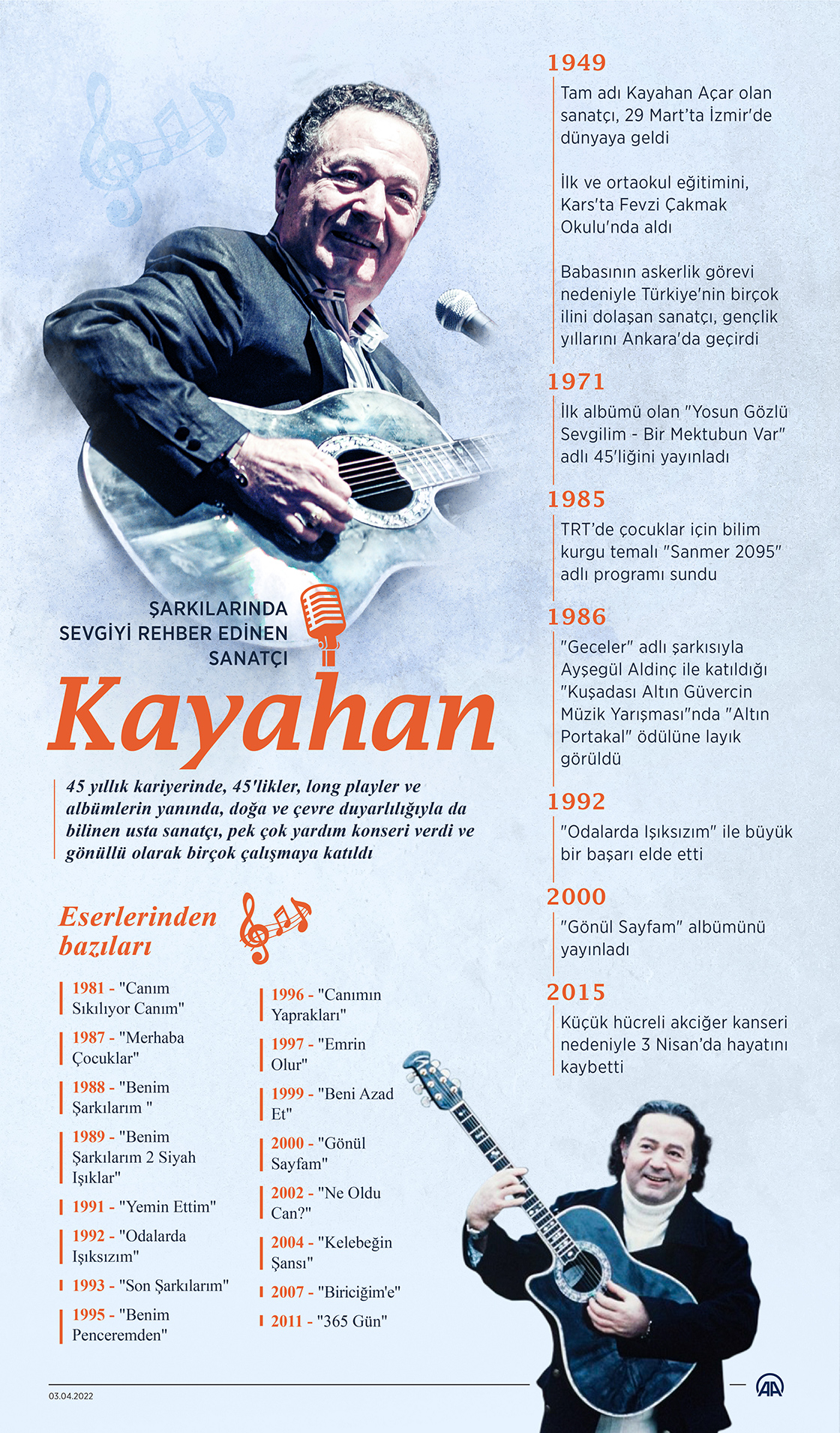Kayahan, Türk pop müziğinde kendi tarzını yaratmış, pek çok eser bırakmış bir sanatçıdır. Söz ve besteleriyle geniş kitlelere ulaşmış; müzikte sevgi, sadakat ve insani değerleri ön planda tutmuştur. Nilüfer, İpek Tüter ve Ayşegül Aldinç gibi önemli sanatçılarla işbirlikleri, onun üretkenliğini ve vizyonunu göstermektedir.