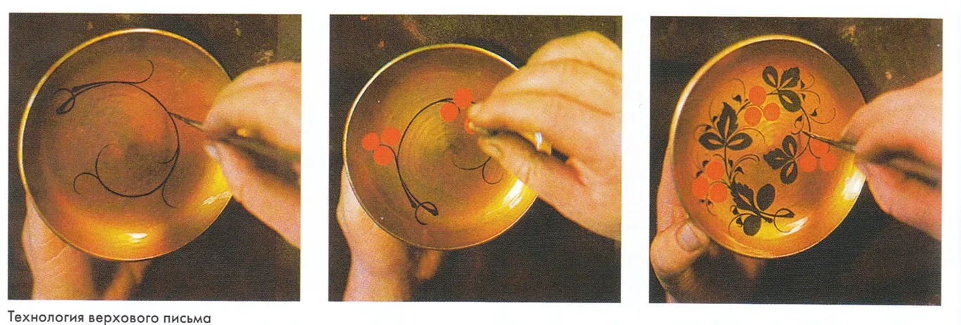 Desen çiziminde geleneksel motiflerin uygulanması için özel fırçalar kullanılır. Fırça darbeleriyle ince ve kalın çizgiler oluşturularak bitkisel motifler çizilir. Trawka (çimen desenleri), jagodka (meyve süslemeleri) ve kudrina (kıvrımlı süslemeler) gibi motifler, bu sanatın karakteristik unsurlarını oluşturur. Fırçaların doğal kıllardan yapılması, sanatçıların detaylı desenleri tek hamlede uygulamasına olanak tanır.
