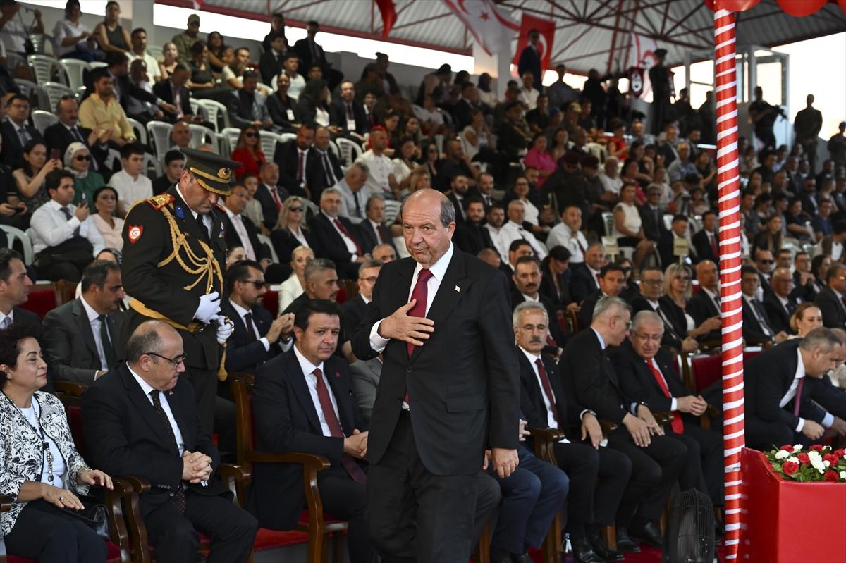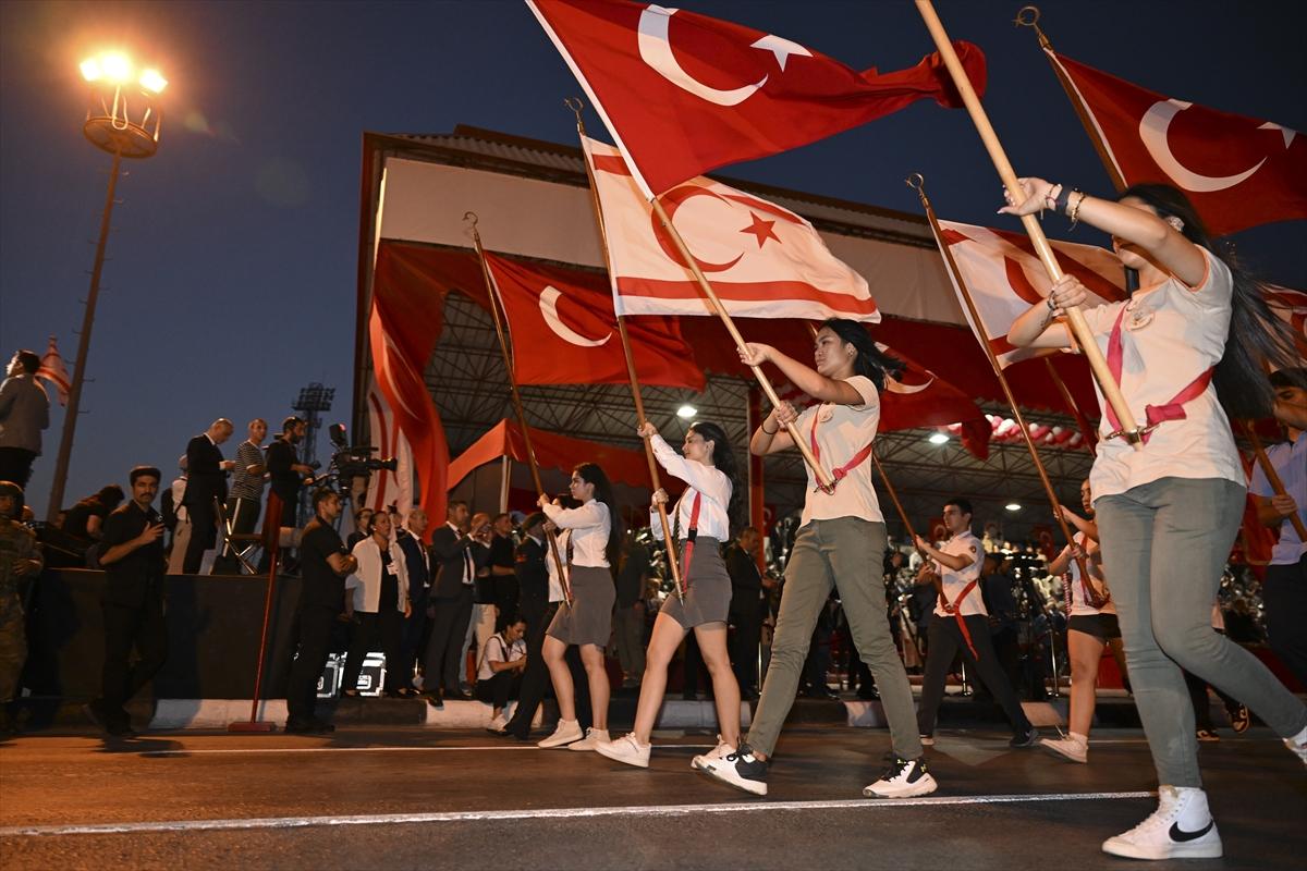 Cumhurbaşkanı Recep Tayyip Erdoğan ve KKTC Cumhurbaşkanı Ersin Tatar, Dr. Fazıl Küçük Bulvarı’nda düzenlenen resmi geçit törenine katılmıştır. Törende, askeri birlikler, bando takımı ve üniversite öğrencilerinin katılımıyla bir geçit gerçekleştirilmiştir. Tören, İstiklal Marşı’nın okunması ve bayrakların göndere çekilmesiyle başlamıştır. Erdoğan ve Tatar, geçit törenini yan yana izleyerek, katılımcılarla bir araya gelmişlerdir.