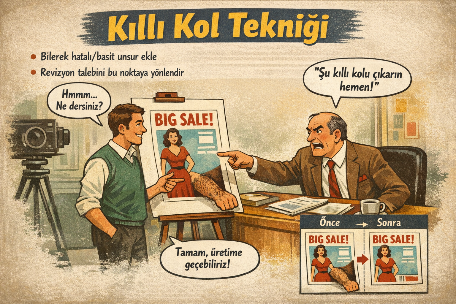 Sıradan revizyon süreçlerinden farklı olarak, “rastgele” ve “kompulsif” biçimde değişiklik isteyen müşterilerle çalışırken başvurulan bir pratik olarak konumlanır. San, profesyonel deneyimi ilerledikçe revizyonların tasarım sürecinin doğal bir parçası olduğunu benimsediğini; ancak bazı müşterilerde her ayrıntıyı “işaretleme/sahiplenme” ihtiyacının belirgin olduğunu ve bu tür uç durumlarda “kıllı kol” yaklaşımını aklına getirdiğini belirtir.