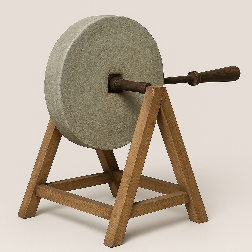Bu unsurlar birlikte çalışarak el gücüyle döndürülen, tamamen mekanik bir bileme düzeni oluşturur.