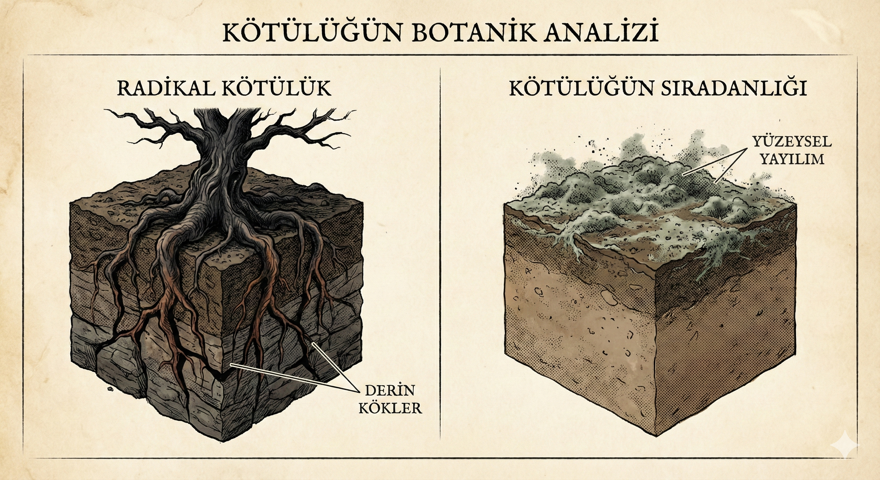 Kötülüğün Doğası Üzerine Karşılaştırma: Derin Kökleri Olan Radikal Kötülük Ve Yüzeyde Yayılan Sıradan Kötülük (Yapay Zeka İle Oluşturulmuştur)