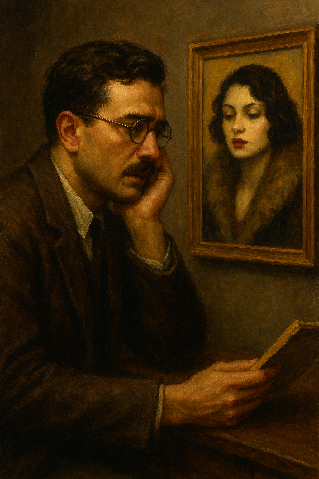 Raif Efendi’nin Maria Puder'in Resmine Aşık Olmasının Tasviri ( Yapay zeka ile oluşturulmuştur)