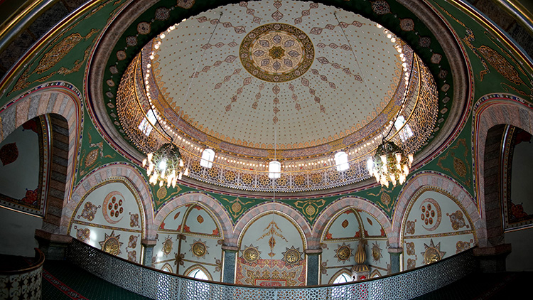 Kubbe kasnağının üstünde sekiz pencere hizasına ayrılmış geniş bir şerit boyunca Besmele ile başlayan Ayet’el-Kürsî yedi bölümde tamamlanmış, sekizinci bölümde ise “Bi hürmeti Seyyid el-Mürselîn vel-hamdü lillahi rabbil âlemîn” ifadesi sülüs hatla yazılmıştır. Bu yazıların üstünde altın yaldızla kufî yazıyla “La ikrahe fi’d-dîn” ve diğer ayetler işlenmiştir. Bunun üzerinde kırmızı sülüsle “Es-serefü nûrullah” diye başlayan ve her bölümü “Allahümme…” ile açılan sekiz dua yer almaktadır. Kubbe eteklerinde, giriş kemeri üzerinde ve iç mekânın çeşitli bölümlerinde hilal motifleri, tarikat sembolü 7 adet taç-ı şerif, besmele, “İnna fetahna leke fethan mübîna” ayeti ve Allah-Muhammed isimleri ile dört halifenin adları yer alır.【3】