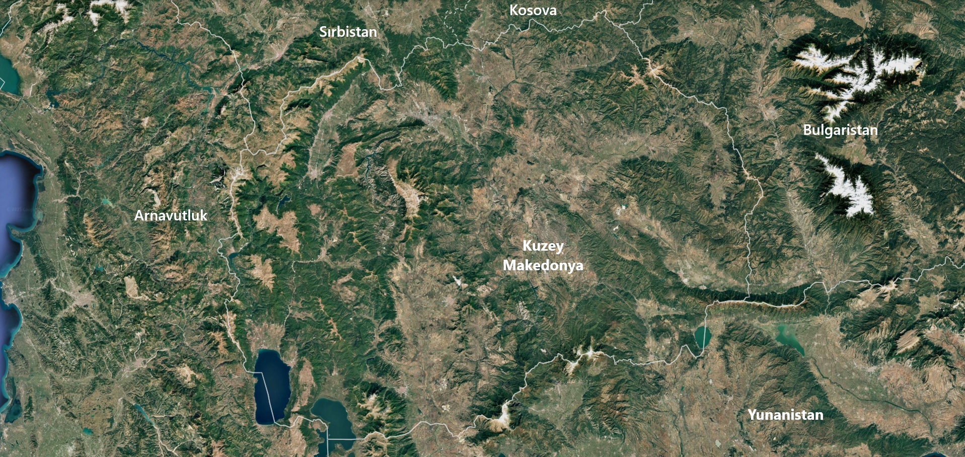 Kuzey Makedonya, Güneydoğu Avrupa’da, Balkan Yarımadası’nın merkezinde yer alan ve denize kıyısı olmayan bir ülkedir. 25.713 km² yüzölçümüne sahip olup, topraklarının büyük bölümü dağlar ve vadilerle kaplıdır. Ülke genelinde dağlık bir arazi yapısı hâkimdir ve sık sık depremler yaşanmaktadır. Makedonya’nın coğrafi yapısı, kuzeydoğu-güneybatı doğrultusunda uzanan geniş vadi ve havza sistemleri ile bunları çevreleyen dağ sıralarından oluşmaktadır. Ülkenin coğrafi omurgasını oluşturan Vardar Nehri Vadisi, doğudan batıya uzanan ana geçiş koridorunu oluşturur. Batıda ve kuzeyde Şar Dağları, Bistra ve Korab Dağları, doğuda Osogovo ve Belasitsa Dağları Bulgaristan sınırına paralel uzanır. Ülkenin en yüksek noktası, 2.764 metre rakımlı Korab Dağı’dır (Golem Korab). Bu zirve, Kuzey Makedonya ile Arnavutluk arasındaki sınırda yer almakta olup, her iki ülkenin de en yüksek dağıdır . Şar erinde yer alan 2.748 metre yüksekliğindeki Titov Vrv ve diğer yüksek doruklar, ülkenin diğer önemli zirvelerini oluşturur. Ortalama rakım 700 metre civarındadır, bu da ülkenin genellikle yüksek rakımlı bir coğrafyaya sahip olduğunu göstermektedir.