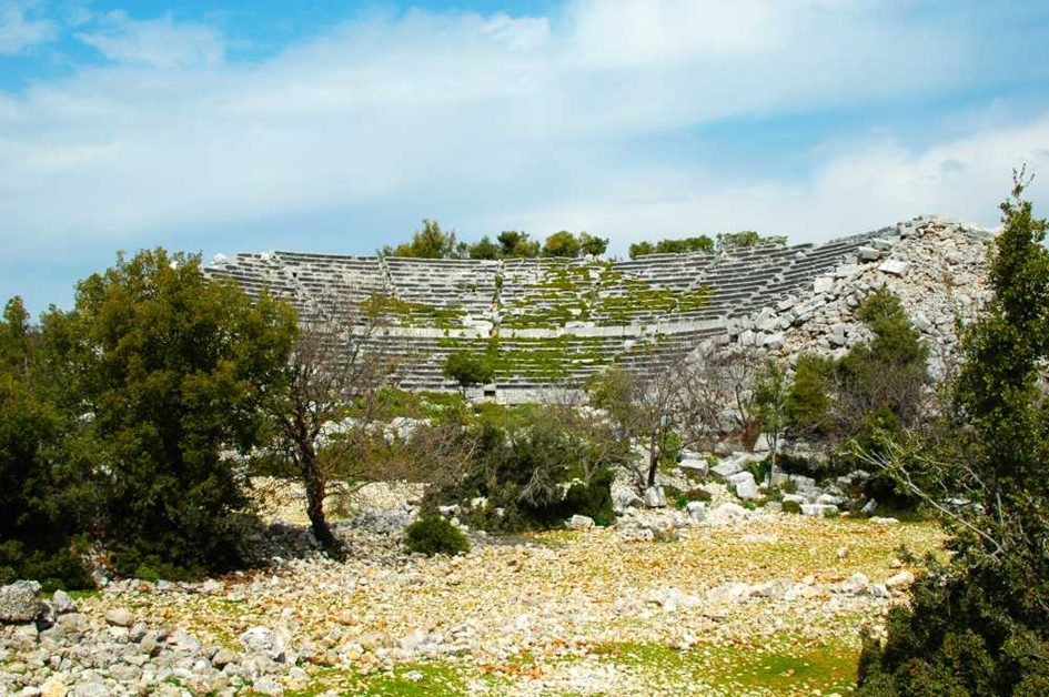 Akropolün batısındaki düzlüğün kuzey kısmında, doğal meyile oyulmuş çift diazomalı Grek tipi bir tiyatro yer almaktadır. Sahne binası (skene) güney yöndeki manzaraya uygun olarak yüksek tutulmamıştır. Tiyatro Likya’nın erken tiyatrolarından biri olup, yaklaşık 2.500 kişilik kapasiteye sahiptir ve Kekova’ya ve diğer Likya şehirlerine bakmaktadır.