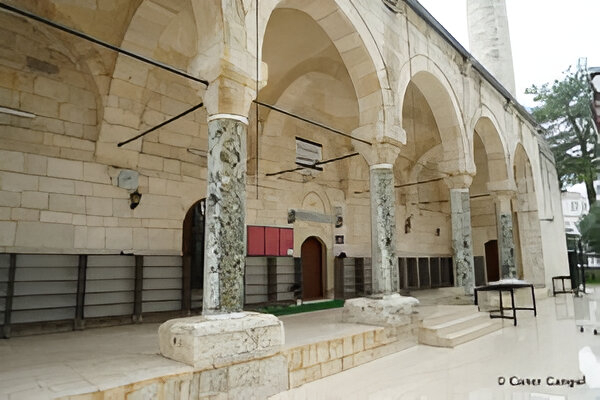 Aslen minaresi olmayan camiye, revak yapılırken batıdaki revak kemeri üzerine zarif bir ezan kulesi eklenmiş, ancak bu yapı 1915 yılında revakla birlikte yıkılmıştır. Minare inşasına 1923’te başlanmış ve 1936’da tamamlanmıştır; bu inşaata ait kitabe, revakın sağında yer alır.