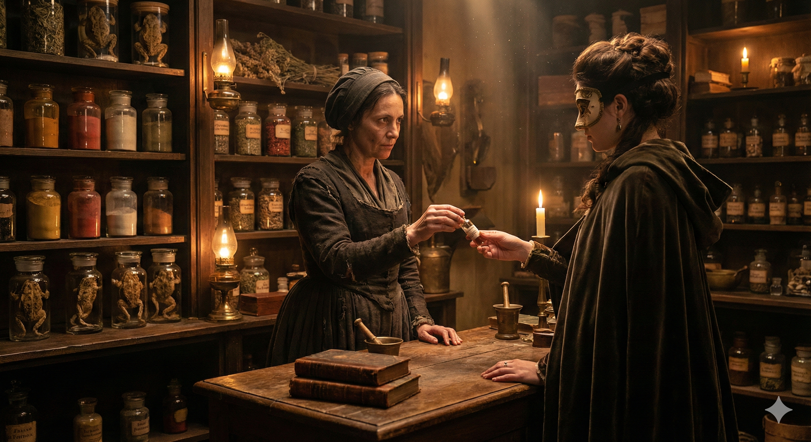 Paris Yeraltı Dünyasında Bir Eczacı Dükkânı Ve "Miras Tozları" Olarak Bilinen Zehirleri Satın Alan Soylu Bir Müşteri (Yapay Zeka İle Oluşturulmuştur)